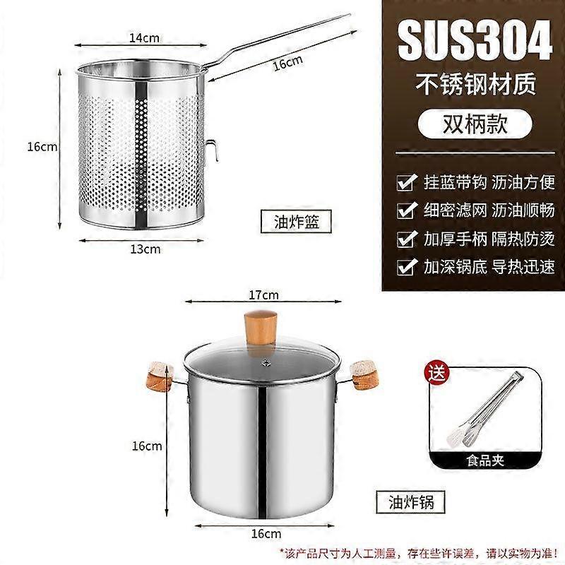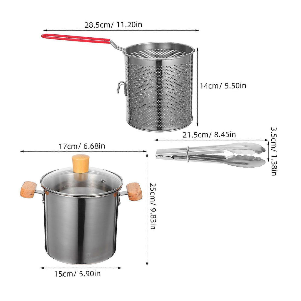 Description This stainless steel deep fryer pot is perfect for home use, featuring a compact design with a convenient basket for frying. Its sleek and stainless steel construction allows longevity and easy cleaning. Ideal for frying skewers, this deep fryer pot is a versatile addition to any kitchen, making it easy to prepare delicious fried foods. Features - Color: Silver -Material:Stainless steel,wood - Size: 25.00X17.00X15.00cm/9.82X6.68X5.89in - Size: 28.50X14.00X13.70cm/11.20X5.50X5.38in - Size: 21.50X3.50X3.00cm/8.45X1.38X1.18in -Firm material: made of stainless steel and wood, this deep fryer pot is easy to clean and built to last, allowing longterm use and enhancing kitchen efficiency -Convenient basket design: the unique design includes a basket that allows for easy oil drainage, maintaining the texture of your food and making it perfect for everyday family cooking -Compact size: thisdeep fryer pot is ideal for small apartments or kitchens with limited area, catering to the needs of individuals or small families -Deep design: the deep structure effectively controls oil splashes, reducing smoke and burn risks during cooking, creating a more comfortable cooking environment -Multifunctional use: this versatile pot is not just for frying; it can also be used for boiling and stewing, making it a multipurpose tool that enhances daily conveniencePackage list: 1 x fryer pot 1 x basket