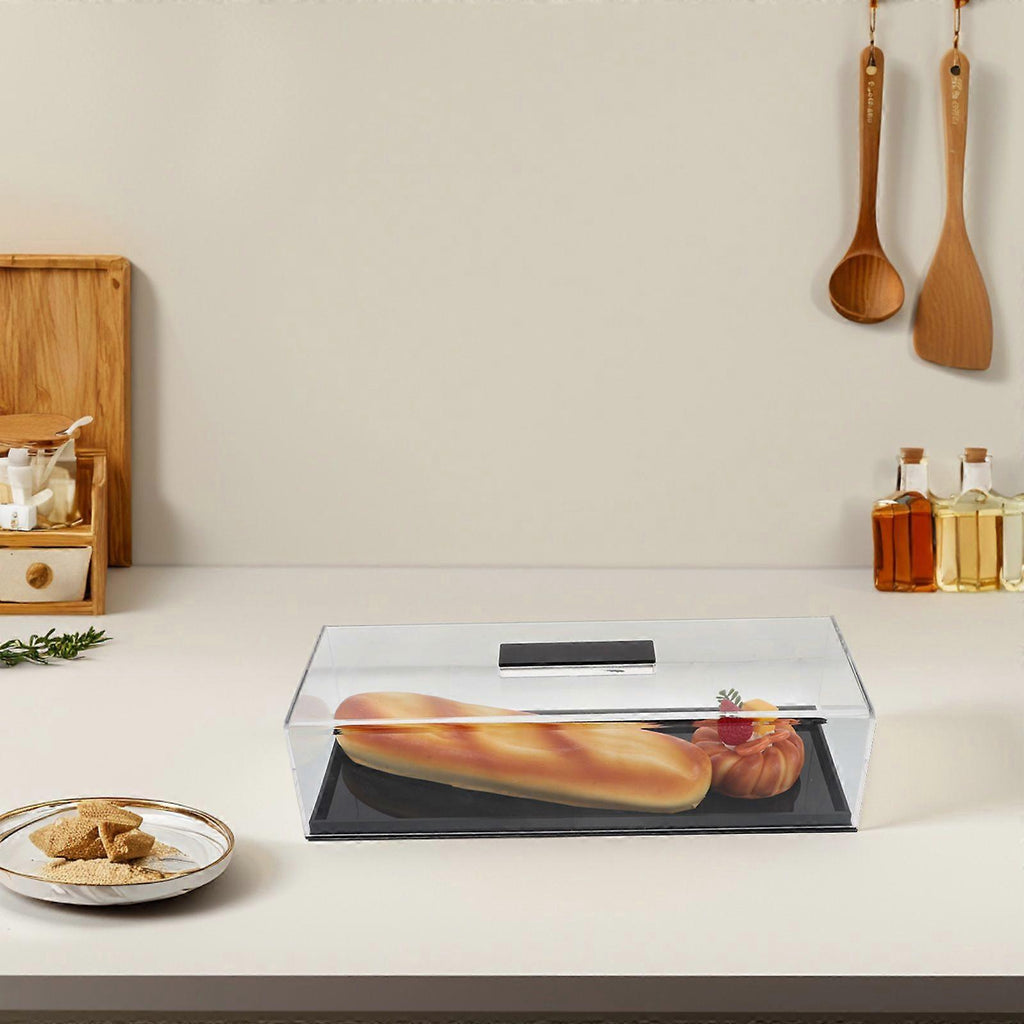 Description This acrylic bread box with a cover is designed to keep your baked goods fresh and presentable. The clear acrylic material allows you to easily see the contents, making it great for displaying cakes, bread, and desserts. Its sleek design adds a touch of elegance to any kitchen or dining setting. Features -Color:Black -Material:Acrylic -Size:35.80X12.70X10.00cm/14.07X4.99X3.93in -Multifunctional design: great for displaying cakes, desserts, and various pastries, making it a versatile addition to any kitchen or bakery -great acrylic material: made from sturdy acrylic, this cake stand is built to last and easy to clean, ensuring longterm use -Spacesaving rectangle shape: the rectangular design saves space and makes it easy to store and carry, ideal for both home and bakery use -Clear lid for visibility: the transparent cover allows for clear visibility of the contents, attracting customers' attention and enhancing presentation -Elegant appearance: the sleek and refined look of this cake stand adds a touch of sophistication and quality to your food displayPackage list: 1 x cake pan