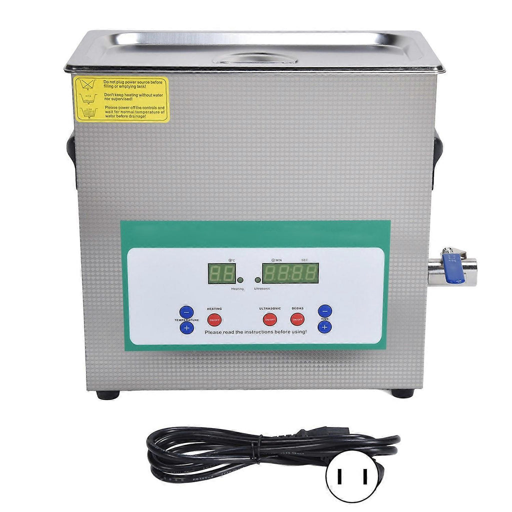 Feature: 1. Bonding Process: Advanced bonding process, non cylinder wear, non nail marks and de cylinder phenomenons. Use reliable transducers to improve conversion efficiency and safety performance. 2. SUS304 Stainless Steel: SUS304 stainless steel cleaning tank is stamped and formed at one time, without welding, and has good waterproof performance. The shell of the washing machine is made of fingerprint resistance stainless steel embossing board, which is beautiful and generous. 3. Constant Temperature Function: With constant temperature function, LED digital display temperature, can be adjusted arbitrarily within the range of 0?80??, can better remove oil and wax, and has significant decontamination effect. 4. Standby Sleep Mode: Standby sleep mode, one key wake up function, has the function of degassing and degassing, realizing the real ultrasonic vacuum. 5. LED Digital Display: Working time LED digital display is adjustable from 1-99 minutes, and can be accurately calculated to the second to meet different cleaning needs. Using core components, ultrasonic efficiency is high, power is strong, and the cleaning effect is good. Specification: Item Type: 6.5L Ultrasonic Cleaner Capacity: 6.5L Inner Tank Size: Approx. 300 x 155 x 150mm / 11.8 x 6.10 x 5.91in Shape Size: Approx. 330 x 180 x 310mm / 13.00 x 7.10 x 12.20in Vibrating Head: 3 Ultrasonic Power: 180W Ultrasonic Frequency: 40KHz Heating Power: 300W Drain: 3/8in Water Valve Time Control: Digital LCD Control 1-99 Minutes Temperature Control: 0-80?? Cleaning Basket: Yes Sound Reduction Cover: Yes Liner Material: SUS304 Stainless Steel Shell Material: Stainless Steel Application Range: Used for hospitals, medicine, schools, scientific research, petroleum, chemical, light industry, metallurgy, machinery, transportation, national defense and other industries, for instruments, meters, electronic devices, circuit boards, semiconductor silicon wafers, magnetic materials, electroplated parts , Hardware, optical lenses and parts, audio heads, polyester filters, spinnerets, latex molds, jewelry, clock parts, accuracy hardware, bearings, oil nozzles, oil pumps and parts in machinery manufacturing, also ideal for deep cleaning of parts with complex geometric shapes and deep holes, blind holes, and uneven surfaces. When cleaning, choose to add the corresponding cleaning fluid, the cleaning effect is better. How to Use: 1. Check whether the ground wire and power wire of the ultrasonic cleaner are leaking. 2. Add cleaning fluid to the cleaning tank. When cleaning, the height of the deep liquid level should not be lower than 1/3 of the cleaning tank. When cleaning, please add the corresponding cleaning agent according to different product requirements to ensure the cleaning effect. All cleaning fluid must conform to the non corrosive ultrasonic cleaning machine slot and shell. 3. Insert the power of the ultrasonic cleaner into the socket, turn on the power switch, the indicator light is on, set the regular cleaning time, depending on the liquid level presents bead network fluctuations, and accompanied by vibration, means that the cleaner has entered the normal working state. 4. Set the cleaning temperature according to the cleaning needs (refer to machines with temperature control). 5. Put the cleaning object into the metal cleaning blue, and set the cleaning time according to the degree of fouling of the cleaning object, usually 3 to 30 minutes, especially difficult to clean substances, the cleaning time can be extended appropriately. NO means continuous work, OFF means shutdown. 6. The heavier objects are hung in the cleaning liquid through the hanger to enhance the cleaning effect and improve the cleaning quality (putting directly will affect the cleaning effect). Small objects can be cleaned in glass filled with cleaning fluid. Generally does not affect the cleaning effect. 7. Take out the cleaning material, replace the cleaning fluid and clean again by ultrasonic or directly rinse with water. 8. When not in use for a long time, drain the cleaning fluid in the tank and scrub the body clean.. Package List: 1 x Cleaning Machine1 x Cover 1 x Cleaning Net1 x Plug1 x User Manual