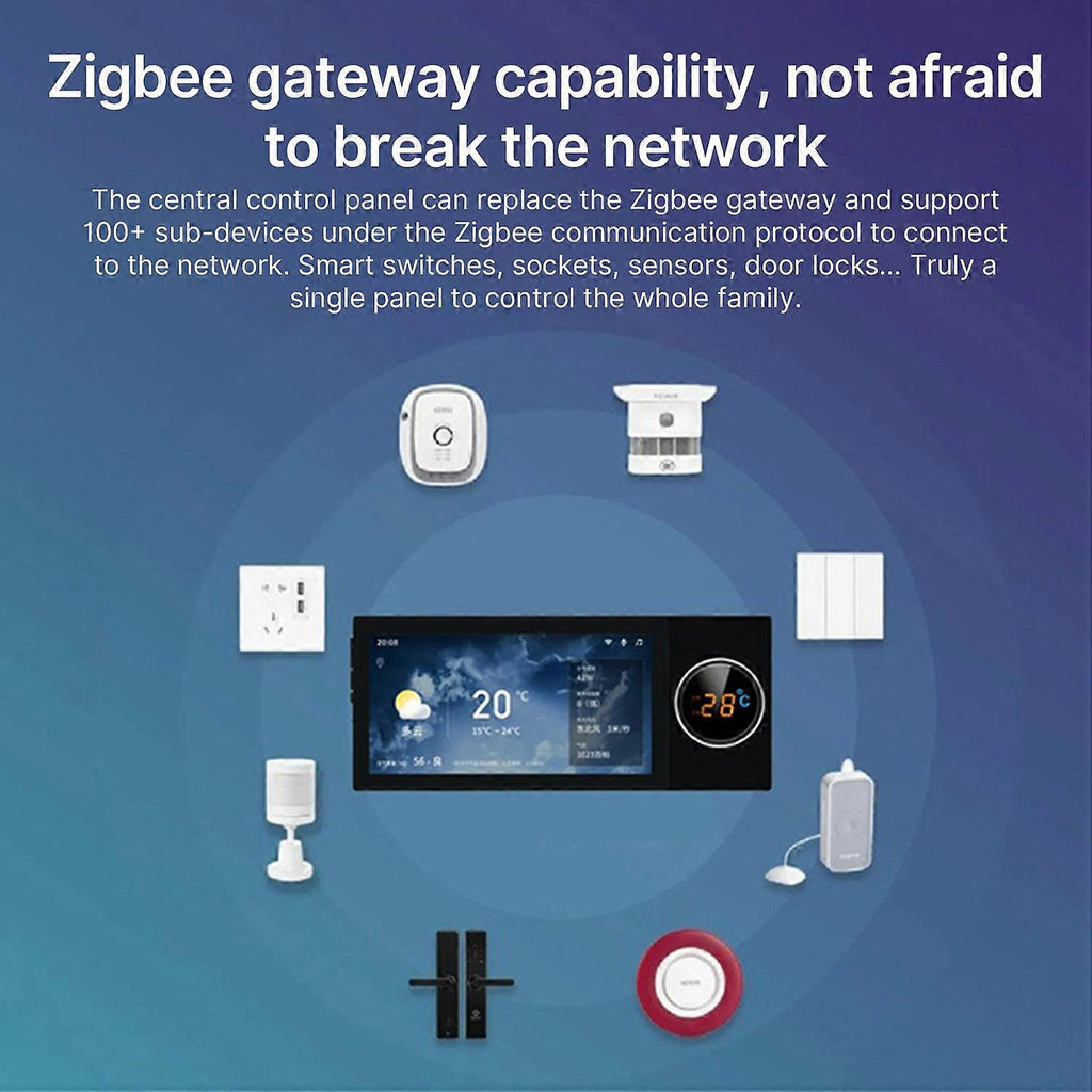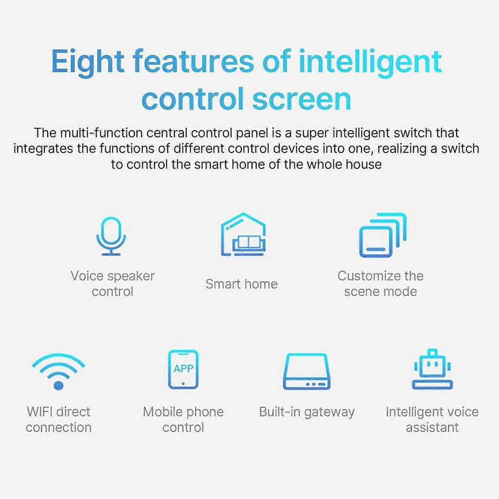 Feature: 1. ??All-in-One Smart Panel??The smart control panel is compatible with a wide range of smart home devices, such as switches, light bulbs, sockets, cameras, air conditioner, thermosta, door locks and more. Truely meet your diversified and individual needs of controlling scattered devices in each room. 2. ??Hands-Free Voice Control??Built-in one voice assistant enables hands-free control of your home devices and scenes, making it easier to control all devices without distance limit at home. 3. ??Built-in Multimode Gateway??Thanks to the hardware capability and local network first strategy, all devices can be controlled when the network is disconnected. 4. ??Multifunctional??The smart control is integrated gateway capability, timing function, devices and scenes control, calendar and weather, alarm lock and etc. You can customizable linkage scenes , touch the panel to quickly switch scene modes. Widely used in hotels, home, office, school, apartment, store, spa and etc. 5. ??Easy to Use and Install??The smart control panel features a 6 inch full touch screen and large knob control, allowing you to clearly view and effortlessly manage and control your smart devices and scenes. Easy to install, just need to replace 2 way switch.(no wire include) Specification: Specifications: Color: Black CPU: Quad core Cortex-A35 Memory: RAM 2CB-ROM BGB Power input: AC 100V-240V 50/60Hz Load power: 200W each way WiFi: WiFi 2.4GHz, 802.11b/g/n Working temperature: 0~40??/32~104?H Working humidity: 5%~90%RH non-condensing Size: 206*86mm/8.11*3.38n Weight: About 300g/10.58oz Package List: Package List: 1 * Smart panel