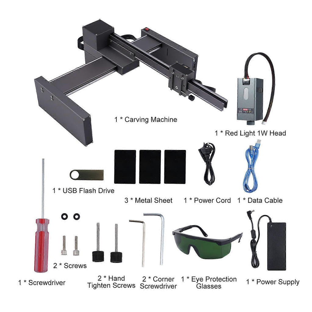 1 * Carving Machine1 * Red Light 1W Head1 * Power Supply1 * Power Cord1 * Data Cable2 * Corner Screwdriver2 * Screws2 * Hand Tighten Screws1 * Screwdriver3 * Metal Sheet1 * USB Flash Drive1 * Eye Protection Glasses