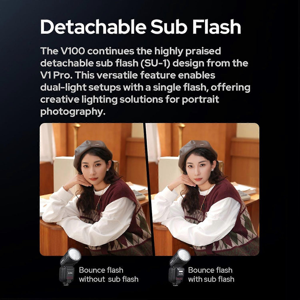 7. Comprehensive Accessory Ecosystem: The V100 camera flash is compatible with a broad range of Godox accessories, including the AK-R1 Accessory Kit for Round Flash Heads, AK-R21 Projection Attachment, AK-R22 Collapsible Diffusion Dome, and the S2 Speedlite Bracket for Bowens, among others.