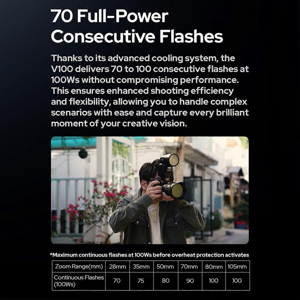 Feature: 1. 100Ws Strong Output Power: Pioneering a new generation of camera flash, up to 100Ws flash power and brand new cooling system to ensure stable and reliable performance. With adjustable power steps from 1/1 to 1/256 or from 2.0 to 10, it covers the spectrum from subtle fill light to robust lighting for diverse scenarios. 2. Effortless Touch Control Screen: Equipped with a 2.3 inch full-color, high-sensitivity touchscreen, the on camera flash offers a smooth and responsive interface. Paired with an intuitive menu design and logical control layout, it allows photographers to quickly adjust power levels, activate high-speed sync, switch between TTL/M modes, and pair devices with a single tap, significantly improving workflow efficiency. 3. High Shutter Speed: Supporting shutter speeds up to 1/80,000 seconds and offering TTL functionality, the camera flash delivers outstanding high-speed continuous shooting with effortless precision. This makes it an ideal choice for sports photography, outdoor bright light, and other fast-paced shooting scenarios. 4. 2.4G Wireless and Instant Sync: With the built-in Godox 2.4G Wireless X System, the camera flash functions as both a master and receiver unit. Its one-tap pairing capability seamlessly integrates with the X3 trigger or other Godox wireless flash units, streamlining multi-flash setups and boosting productivity. 5. Round, Soft and Even Light: The classic round flash head of the camera flash offers round, soft and even light effects. Built-in LED modeling lamp with adjustable brightness from 1 to 10 gives convenience in lighting and focusing. The detachable sub flash enables dual-light setups with a single flash, offering creative lighting solutions for portrait photography. 6. Fully Upgraded Power Supply and Charging: The round head camera flash comes with a 7.2V 2980mAh lithium battery that provides 400 flash times on a single charge.The Type-C charging port and compatibility with the VC26T Multi-Battery Charger(not included) make recharging quick and convenient. 7. Comprehensive Accessory Ecosystem: The V100 camera flash is compatible with a broad range of Godox accessories, including the AK-R1 Accessory Kit for Round Flash Heads, AK-R21 Projection Attachment, AK-R22 Collapsible Diffusion Dome, and the S2 Speedlite Bracket for Bowens, among others. Specification: Item Name: Round Head Camera FlashPower(1/1 output): 100WsFlash Duration: 1/300s-1/20000sExposure Control System: TTL Auto Flash and Manual FlashFlash Exposure Compensation: 3 steps with 1/3 increasement each stepSync Mode: High-speed sync(up to 1/8000s, up to 1/80000s with S' global shutter camera), first-curtain sync, and second-curtain syncMulti Flash: Provded (up to 100 times,100Hz)Wireless Function: Sender, ReceiverSender Groups: M,A,B,C,DControllable Receiver Groups: A,B,C,D,ETransmission Range (approx.): 100mChannels: 01~32ID: OFF/01~99Modeling Flash: Fired with camera's depth-of-field preview buttonEffective Range (approx.): Center: 0.6~10m/2.0-32.8 feet, Periphery: 0.6~5m/2.0-16.4 feetLED Modeling Lamp Power: 2WColor Temperature: 3300K??200KBuilt-in Lithium Battery: 7.2V/2980mAhRecycle Time: Approx.1.7s. LED indicator wil light up when the flash is readyFull Power Flashes: Approx. 400 timesPower Saving: Provide standby and auto off functionsSync Triggering Mode: Hot shoe, 2.5mm sync cordNet Weight: 496g(without battery), 619g(with battery) Package List: 1 * Camera Flash1 * Mini Stand1 * Storage Bag1 * Type-C Charging Cable1 * Power Adapter1 * Lithium Battery1 * Users Manual
