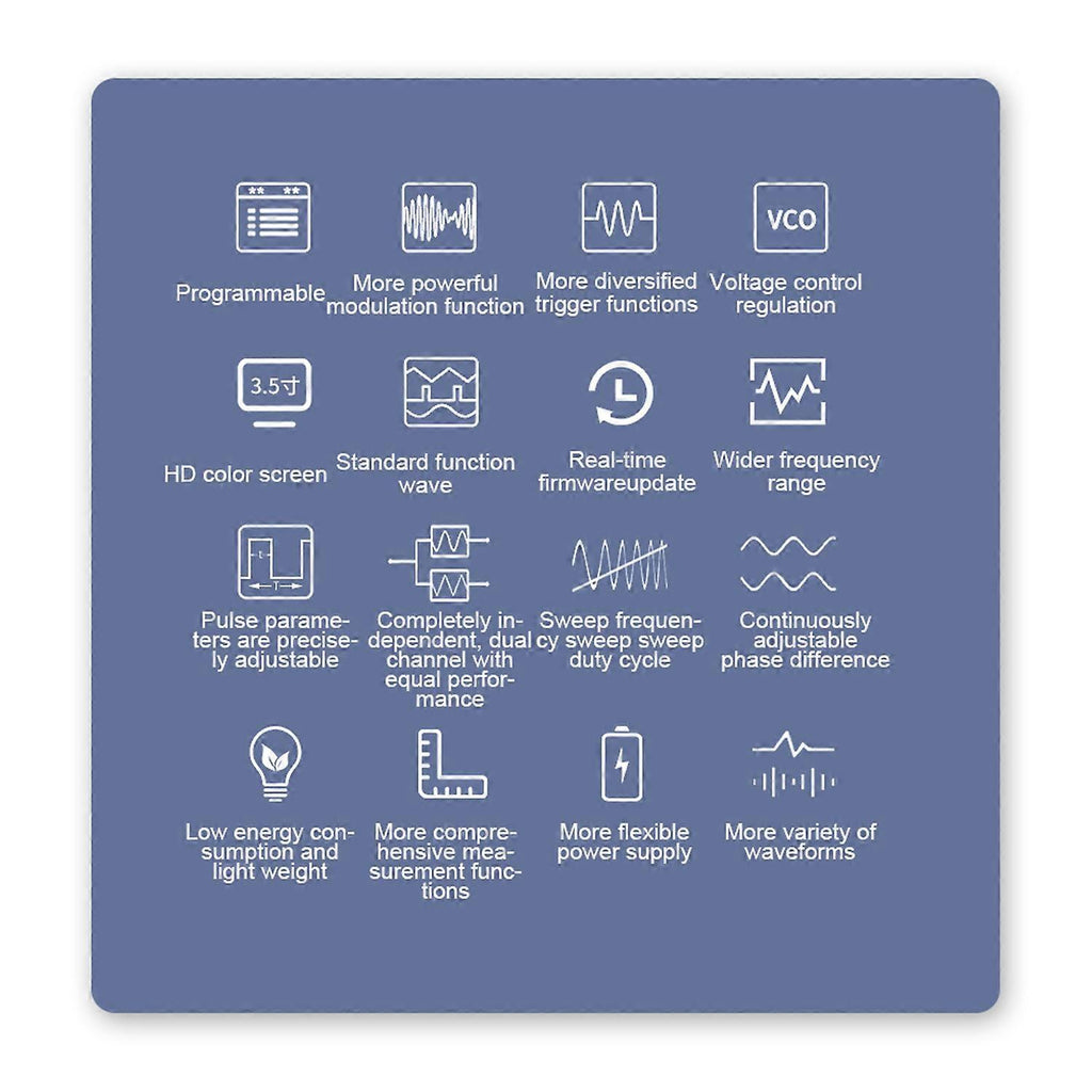 Sine waves, square waves, pulse waves (duty ratio, pulse width and cycle time can be set accurately), triangular waves, rising ramp, falling ramp, CMOS waveform, DC level, half waves, full waves, sine waves, Inverse order waves, exponential rise, exponential fall, Lorentz pulse waves, multisonic waves, random noise waves, trapezoidal pulse waves, sinking pulse waves, amplitude modulation waveform, frequency modulation waveform and 99 user-defined waveforms.