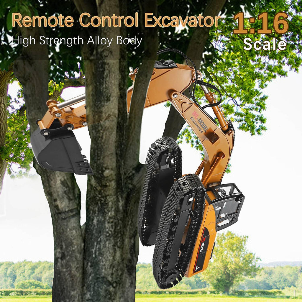 ? High Simulation Structure Design: 1:16 scale RC electric excavator toy possess independent joint control, rotating worktable, alloy track, simulated non-toxic smoke, strong power, simulated sound effects, high-brightness LED lights, which is detailed just like real, great for entertaining and educating.