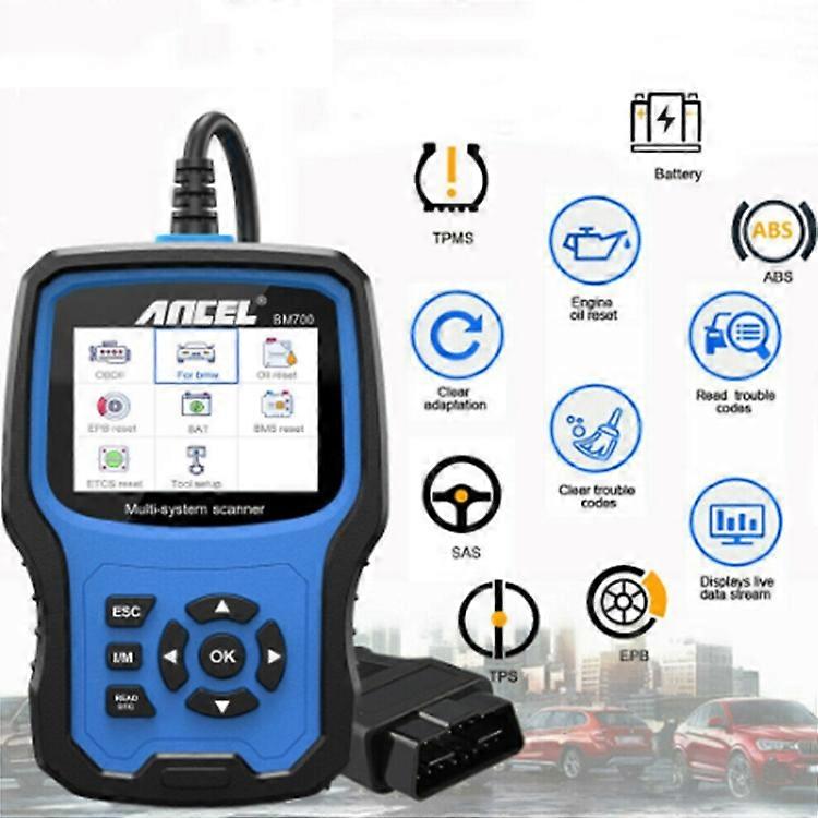 ANCEL BM700 For BMW Full System Diagnostic OBDII Tester Maintenance And Resetting Repair Tools 1. This professional scanner for BMWMini can read the fault code memory of your vehicles ECU (such as engine, transmission, ABS, TPMS, SRS, air conditioning, anti-theft system, etc.) and gain in-depth understanding of your vehicles condition, and supports body, chassis, drive and all control module inspections. All error codes can be deleted after diagnosis. This helps you detect errors before damaging your vehicle. 2. OBD-level diagnosis for all car brands: allows you to easily diagnose engine problems and turn off warning lights. 3. It can not only accurately determine the code and possible causes, but also perform OBD test modes such as real-time data streaming, EVAP system testing. Real-time parameters display the vehicles sensor data for a better understanding of your car. 4. Strong compatibility, supports modern and older B-M-W models with OBD I port from 1987-1996. Applicable to all gas-powered cars from 1996 and newer. 5. Supports 12 different languages ??(English, French, Spanish, Russian, Italian, Portuguese, German, Finnish, Polish, Danish, Swedish, Norwegian), easier to use, localized language diagnostic reports are more professional. 6. BM700 can read fault codes from all important built-in electronic control units, deeper than OBD level. You will receive the exact same codes as any professional garage, as well as an explanation of the severity. After performing the diagnosis, you will receive a fault report, but not every fault code means a current defect. Clear the OBD and manufacturer-level codes and perform a second diagnosis. The remaining codes require your attention. 7. BM700 scanner with 2.8-inch TFT 262K true color display, the test results are displayed on the LCD, and the data is very easy to understand. 8. Basic functions: read and erase fault codes; read data stream; retrieve VIN information. 9. Advanced functions: CBS resetcorrection, EPB replacement, SAS learning, DPF regeneration, EGS clear adaptation, batte