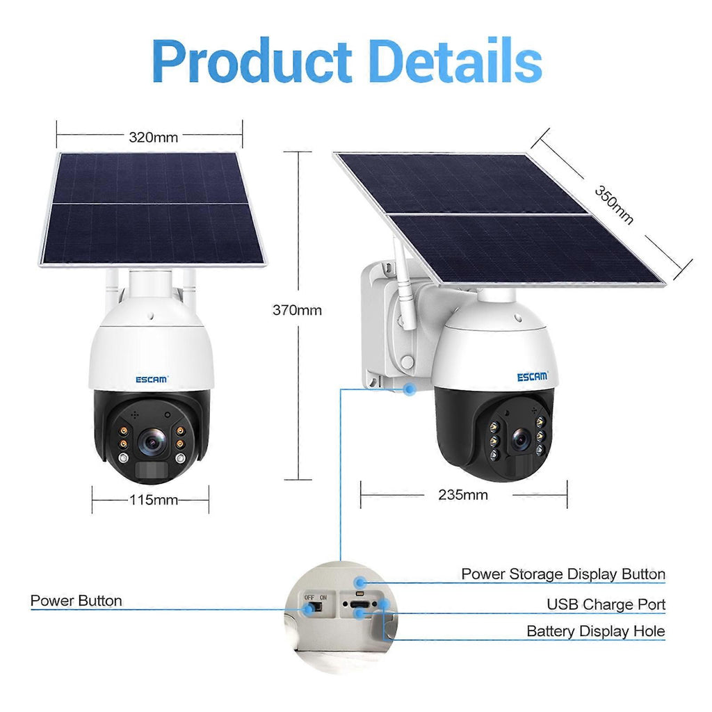 ESCAM QF724 3MP 24h Recording Cloud Storage PT 4G PIR Alarm IP Camera with Solar Panel, European Signal Bands Features: 1. 20W foldable solar panel, integrated installation or split installation 2. 24 hours long video recording + low power sleep dual mode 3. Built-in large-capacity lithium battery, support 7 days x 24 hours of video recording in rainy days 4. Adopt high performance ISP and 12.7 inch black light image sensor 5. 3MP, 2048x1536 HD video 6. Built-in microphone and speaker, support two-way voice intercom 7. Support cloud storage + local storage. 8. APP support AndroidIOS 9. Metal shell, IP66 outdoor waterproof parameter: 1. Main control chip: Ingenic-T31ZL 2. Compression format: H.265 3. Pixel: 3MP, 2048*1536 4. Networking method: 4G: TD-LTE, TD-LTE LTE FDD TD-LTE LTE-FDD 4G mode fast version: US version European version (optional) 5. Alarm mode: Detection mode: PIR human body induction + AI humanoid detection Detection distance: 0-12M Detection angle: 95 degrees Alarm method: real-time call to mobile phone or information push 6. PTZ: Angle: horizontal 355 degrees, vertical 100 degrees Rotation speed: horizontal 55 degreessecond, vertical 40 degreessecond 7. Night Vision Mode: Full color night vision: illumination 0.00LUX Infrared light: Infrared LED distance 30M White light: White LED distance 30M 8. Voice: Built-in speaker: 3W Built-in microphone: monitoring range 20M 9. Lens: Focal length: 3.6mm Angle: 95 degrees 10. Storage: Cloud storage: alarm event recording Local storage: TF card (128G max can record 20-25 days) 11. Power supply: Power supply mode: solar panel + battery Solar cell material: monocrystalline silicon Solar cell power: 20W Battery: 6 21700 batteries 30000MAH Working power: 4W max Standby power: 0.003W 12. Working temperature: -30~+60 degrees Celsius 13. Working humidity: 0%~90%RH
