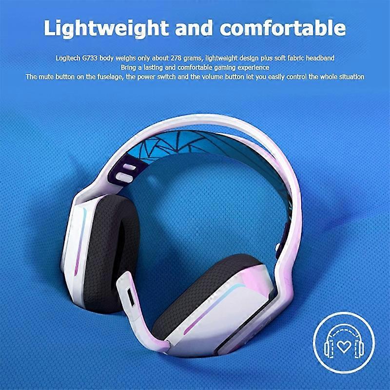 Logitech G733 LIGHT SPEED Wireless RGB Gaming Headset Feature 1. Lightweight design and soft fabric headband bring a long-lasting and comfortable gaming experience. 2. The fuselage mute button, power switch and volume buttons allow you to easily control the overall situation. 3. Long-lasting battery life, about 29 hours, equipped with Type-C charging interface. 4. LIGHT SPEED wireless audio transmission and a wireless range of about 20 meters allow you to move easily and freely. 5. Equipped with DTS Headphone:X 2.0, 7.1 surround sound technology brings extraordinary audio clarity. In FPS games, it allows you to grasp more environmental clues. 6. Equipped with a detachable microphone and iconic BLUE VOICE technology to provide you with accurate voice performance without delay. The microphone filter makes your voice full and transparent. 7. Approximately 16.8 million colors are individually configured for the headphone microphone lighting in the entire spectrum, and the front dual-zone RGB lighting includes preset animation effects. 8. The audio control key on the back of the headset can freely adjust the volume and mute. Specifications Headset: 1. Drive unit: Hybrid grid PRO-G 40mm 2. Frequency response: 20Hz-20KHz 3. Impedance: 39 ohms (passive), 5K ohms (active) 4. Sensitivity: 87.5dB SPL @ 1mW & 1cm Microphone: 1. Pickup pattern: heart-shaped (one-way) 2. Frequency response: 100Hz-10KHz