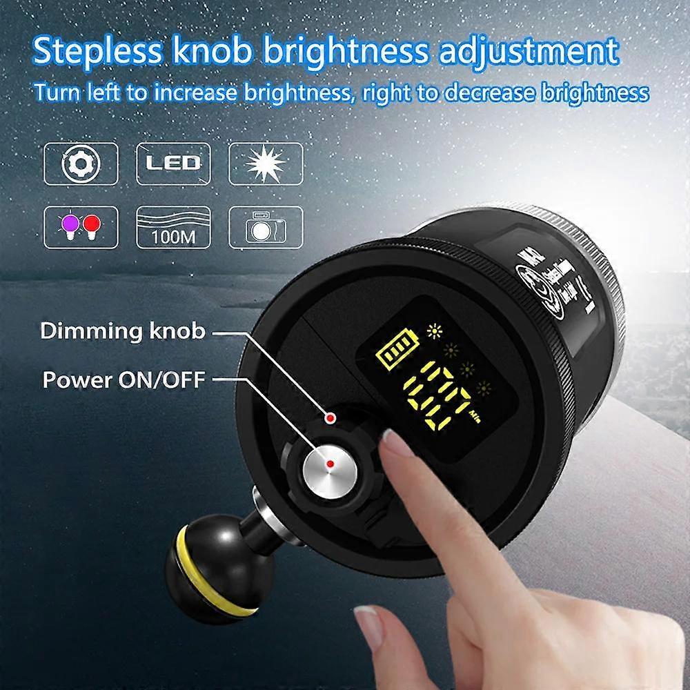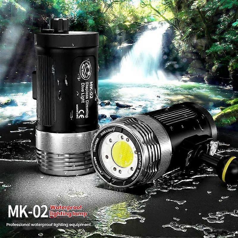 Sea Frogs MK-02 100m Depth Waterproof Diving Flashlight 6000LM Strong Light 6 Light Modes 1. Multifunctional underwater fill light, 6000 lumens strong light output, waterproof to 100 meters328 feet 2. Multiple lighting modes, fiber optic flashwhite lightred lightpurple lightSOS, all-round fill light, knob infinitely adjusts brightness 3. High-hardness aluminum alloy lamp head, rust-proof, corrosion-proof and drop-proof 4. COB high-quality wick, stable light source, no stroboscopic and no glare, high color rendering light, restore the true color of the seabed 5. LED screen displays the light source status in real time, and the information is clear at a glance Specifications: 1. Brightnessbattery life: --Fiber optic flash trigger: 6000 lumens??5000 times --High light mode: 6000 lumens??1 hour --Low light mode: 4500 lumens??2.5 hours --SOS: 6000 lumens??2.5 hours --Red light: 3w??5 hours --Purple light: 3W??5 hours 2. Battery specifications: Rechargeable 18650 lithium battery x4pcs (battery not included) 3. Control mode: button + knob + fiber optic flash trigger 4. Flash trigger index: GN 23 5. LED specifications: White light COB 60w (5000-6000K) x 1pc; Red light 3W x 4pcs; Purple light 3W x 4pcs 6. Illumination angle: greater than 120 degrees 7. LED life: 50,000 hours 8. Main material: PC110+aluminum alloy 9. Dimensions: 62x67.5x141mm 10. Weight: about 330g
