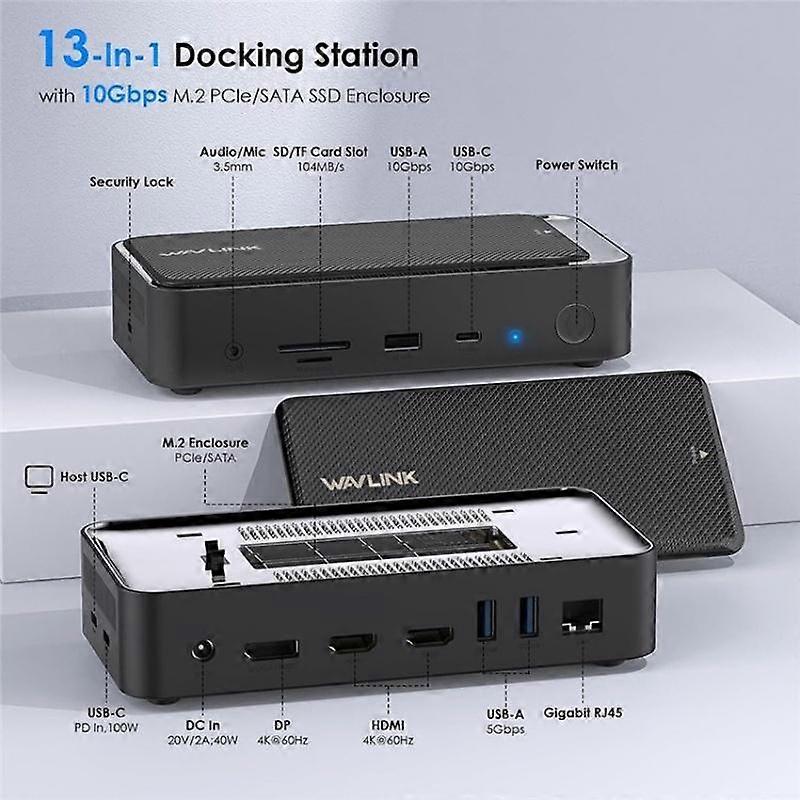 WAVLINK UMD23M For Laptop Tablet 13 in 1 USB-C Hub 10Gbps M.2 Pcie SATA SSD Enclosure 1. 13-in-1 Versatile Docking Station: WAVLINK USB-C hub features an integrated M.2 SSD enclosure, 4K 60Hz DisplayPort, dual 4K 60Hz HD ports, USB-A and USB-C ports, Gigabit Ethernet, SDTF card slots, and more, offering comprehensive connectivity for your laptop. 2. Triple 4K Display Support: Connect up to three displays with dual 4K 60Hz and one 4K 30Hz resolution through 2 HD and 1 DisplayPort. Ideal for expanding your workspace or mirroring screens. 3. High-Speed Data Transfer: Built-in M.2 SSD enclosure supports both PCIe NVMe and SATA SSDs. 10Gbps USB-A and USB-C ports enable rapid file transfers, while SDMicro SD card slots offer simultaneous reading at speeds up to 104MBs. 4. 100W Power Delivery: Supports laptop charging up to 100W through the USB-C PD port, ensuring a stable power supply during your work sessions. (PD charger not included) 5. Wide Compatibility: Compatible with Thunderbolt 34 laptops and devices featuring full-function USB-C ports. Supports various operating systems including Windows, macOS, Chrome OS, Linux, and mobile platforms. Specifications: 1. Model: WL-UMD23M 2. Ports (13-in-1): Front: 1x 3.5mm audiomic, 1x SD card slot (104MBs), 1x TF card slot (104MBs), 1x USB-A (5Gbps), 1x USB-C (5Gbps), 1x power switch Rear: 1x DC In (20V2A); 40W), 1x DisplayPort (4K 60Hz), 2x HD (4K 60Hz), 2x USB-A (5Gbps), 1x Gigabit RJ45 Ethernet (Side) 1x M.2 Chassis (PCIeSATA), USB-C (Host), USB-C PD IN (PD 100W), 1x Lock 3. Dimensions: 17.5 x 8 x 4 cm 6.9 x 3.1 x 1.6 inches (WxDxH) 4. Cable length: Power cable: 120cm47in; USB-C to USB-C cable: 100cm39.4in 5. Weight: 367g12.9oz 6. Shell material: ABS plastic Notes: 1. When using the dock (with adapter), please connect the "DC In" port to the power supply. 2. The host's type-C port must support video output and charging to enjoy the full functions of this dock (Your USB-C mobile phone and tablet should support OTG function ) 3. To