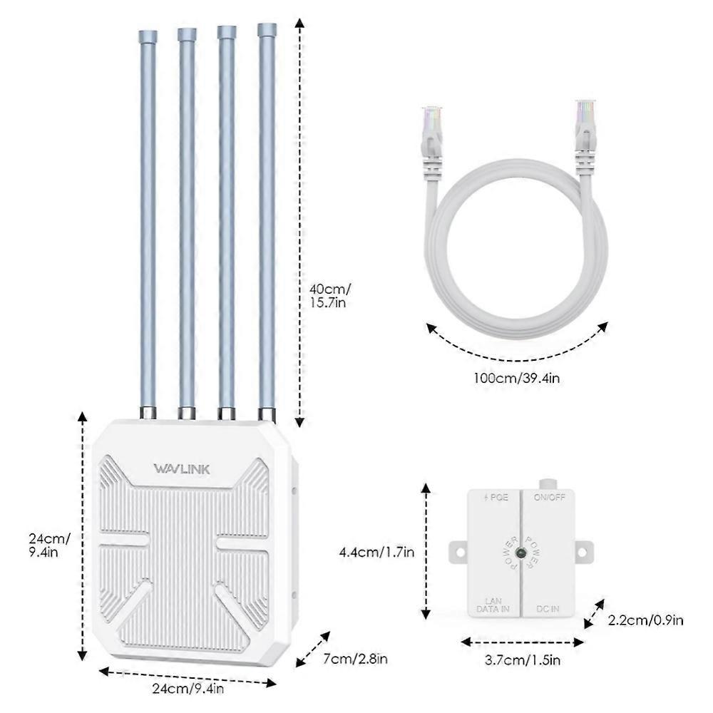 WAVLINK WN573HX1 WiFi 6 AX1800 IP67 Waterproof Outdoor Dual Band Wireless WiFi Routers 1.Supports 160MHz bandwidth and 1024-QAM faster wireless connectivity 2.Supports MU-MIMO and OFDMA technologies to communicate effectively with multiple devices simultaneously Multiple PoE options for easy installation 3.Supports 802.3afat main PoE power supply and passive PoE power supply, making installation convenient and flexible 4.Four 8dBi omnidirectional detachable antennas greatly enhance the signal. Glass tube antenna has high accuracy, corrosion resistance, long service life, and strong wind resistance 5.Durable and weatherproof IP67 casing protects access points from harsh outdoor conditions and provides stable wireless coverage of up to 200-300 meters 6.Set up within minutes to easily manage WiFi settings and monitor data usage with the WavRouter application or web UI 7.It can be easily installed on walls or poles with the provided installation kit Specification: 1.Ethernet interface (RJ45): 1 ?? 101001000Mbps WANLAN port (POE) 2.Power adapter: Input: 100-240VAC. 5060Hz; DC 54V0.3A Ethernet power supply (passive); DC 48V Ethernet power supply (Active) 3.Wireless standard: IEEE 802.11axacna 5 GHz; IEEE 802.11nbg 2.4 GHz 4.Frequency: Dual Band, 5GHz: 1201mbps, 2.4GHz: 574mbps 5.Working mode: AP, repeater, mesh router, mesh extender 6.Encryption: WPA2-PSK, WPA3-PSK, WPA2-PSK mixed 7.Roaming protocol: 802.11 kv 8.Antennas: 2 x 8dBi 2.4GHz omnidirectional antennas, 2 x 8dBi omnidirectional 5GHz antennas 9.Working environment: Working temperature: 0~40 degree centigrade , working relative humidity: ten to ninety percent, non condensing 10.Storage environment: Storage temperature: -10~70 degree centigrade , relative humidity: ten to ninety percent, non condensing 11.WAN types: PPPoE, dynamic IP, static IP 12.Cloud Services: AutomaticOTA Firmware Upgrade