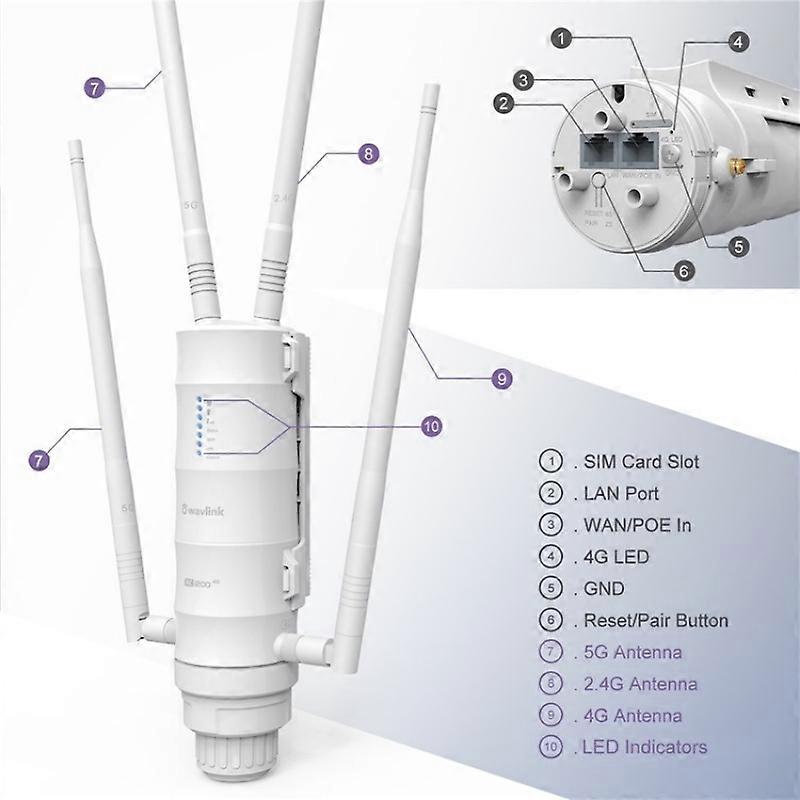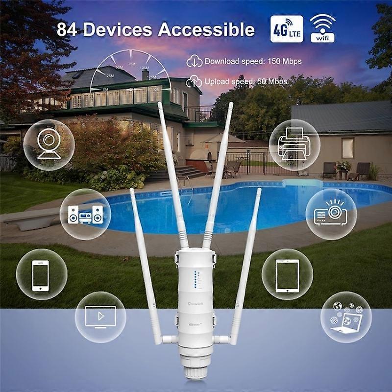 WAVLINK WN572HE4D AC1200 4G LTE WiFi Dual Band 4 Detachable Antennas Router 1.The AC12004G LTE dual-band high-power outdoor Wi-Fi router adopts LTE Category 4 technology and is individually configured with a 4x7dBi omnidirectional antenna and a 2x5dBi internal omnidirectional antenna. Supports access to the Internet through HSPALTE data Nano SIM card or Internet accessPPPoE working mode. If you dont have a 4G Nano SIM card, you can use it to connect to a modemrouter and work in router mode. 4G connection speeds of up to 150Mbps download50Mbps upload, plus 2.4GHz 300Mbps and 5GHz 867Mbps wireless speeds, even in harsh conditions, thanks to its weatherproof design. The connection distance can be up to 200 meters (depending on actual environmental changes), and it is suitable for providing free Wi-Fi services in factories, communities, streets, etc. You can run multiple applications in a large home or office 2.MU-MIMO Matters: Equipped with 802.11ac Wave 2 MU-MIMO technology, this outdoor router can easily provide dual-band Wi-Fi to multiple devices at the same time. Say goodbye to bandwidth congestion. 3.Wide range transmission: 4*7dBi omnidirectional antenna, perfect long-distance performance, connection distance up to 200 meters (may vary depending on actual environment) 4.PoE power supply: Supports Ethernet power supply (including PoE adapter), and you can easily run the power supply by plugging in the network cable. Pole or wall-mount design allows flexible deployment and convenient installation 5.Mesh Network: Supporting advanced Mesh technology, you can connect our WN572HE4 with other wavlink Mesh devices to form a Mesh WiFi system and enjoy seamless and smooth Internet roaming 6.4G CAT4 speed: This 4G router provides a faster and better broadband experience, with download speeds up to 150Mbs and upload speeds up to 50Mbs, easily bringing you an excellent Internet experience 7.Dual-band access: With total speeds up to 1200Mbps, it shares both 2.4 GHz 300 Mbps and 5 GHz 867 Mbps dual-band Wi-Fi networks, perfect