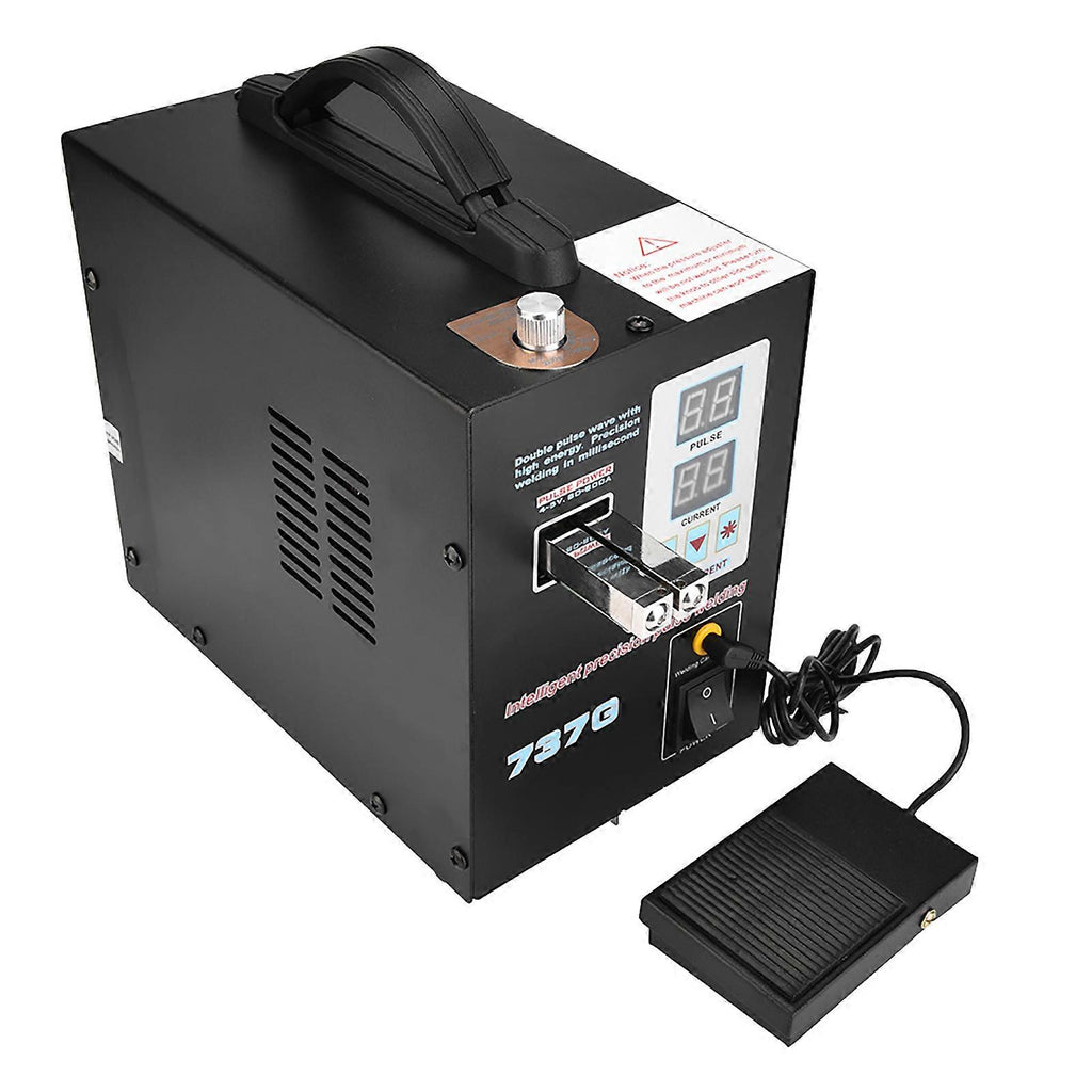 Features:Dual welding modes.Welding pulse selection: Single pulse and dual pulse.Welding current and welding pressure setting.LED lighting function for accurate welding in low luminance environment.Foot pedal switch for welding calibration control.Specification:Color:BlackPlug type: UK plug 220VPrimary current: 2A~15AWelding current: 60A-800AWelding pressure: 200g~700gSingle pulse welding: 0.05~0.12mm thick nickel sheet2 pulse welding: 0.12~0.2mm thick nickel sheetItem size: 140*245*200mm / 5.5*9.6*7.9inPackage weight: Approx. 4950g / 174ozPackage list:1 * Spot Welder1 * User Manual1 * Foot Switch4 * Spot Welding Needle1 * Hex wrench1 * Battery Holder2 * Fuse Tube30 * Nickle Plated Sheet 0.1*4*100mm30 * Nickle Plated Sheet 0.15*5*100mmNote:Please kindly make a note if you need any plug adapter. .