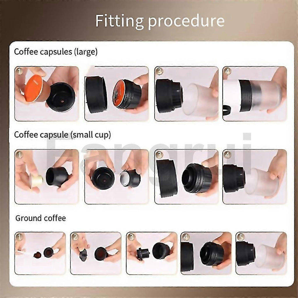 Fangrui Product Details [multi-compatible] The 3-in-1 Portable Espresso Machine Is Equipped With A Ground Coffee Compartment And A Capsule Compartment, Which Is Compatible With Small And Large Capsules And Ground Coffee. [portable And Convenient] The Portable Espresso Machine Is Suitable For Many Occasions, Convenient And Easy To Carry, And Can Be Brewed Directly. [intelligent Extraction] Portable Espresso Machine Adopts Intelligent Heating Function, Convenient Extraction, Double-click The Power Switch, Open The Heating Extraction Function, Heating Extraction. Long The Power Switch, Directly Open The Extraction Function, Convenient Operation, Suitable For All Kinds Of Hot/cold Drinking Water. [convenient Charging] Portable Espresso Machine Can Be , Portable Charging, Equipped With Type-c Usb Cable Charging Methods, Support Charging While Using, Suitable For Travelling, Camping, Driving, Home And Office. [easy To Rinse Good To Disassemble] The Portable Espresso Machine Is Designed With Several Parts Separated, Easy To Clean. Co
