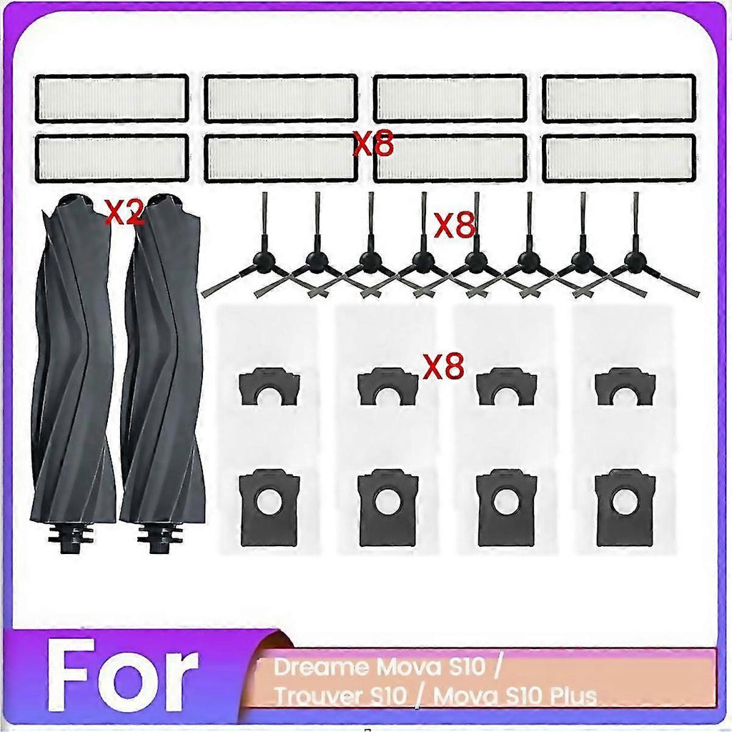 Fangrui Product Details Fangrui Product Details Practicality: This Accessory Kit Is Designed For Dreame Mova S10/trouver S10/mova S10 Plus Vacuum Cleaner. The Product Set Includes 2 Roller Brush,8 Side Brush,8 Filter,8 Dust Bag. The Main Brush Can Easily Comb The Hair And Remove Stubborn Stains Very Effectively Without Causing Any Damage To Various Floors, Such As Tiles, Marble And Wooden Floors. The Side Brush Can Clean Corners And Edges Quietly And Effectively Without Causing Any Damage To The Floor Or Furniture. The Bristles Can Penetrate Deep Into The Corners And Edges, Effectively Removing More Dirt And Dust, Making The Floor Cleaner. The Filter Is Synthesized From A Variety Of Durable Materials And Can Capture Up To 99. Of Dust, Dirt, Hair And Other Fine Particles. Installing The Filter Ensures Optimal Cleaning Performance While Reducing Dust Particles In The Air, Removing Odors In The Air, Creating A Healthier Breathing Environment, Making The Machine Run Better For A Long Time, And Extending The Life Of The Machine. User-friendly Installati