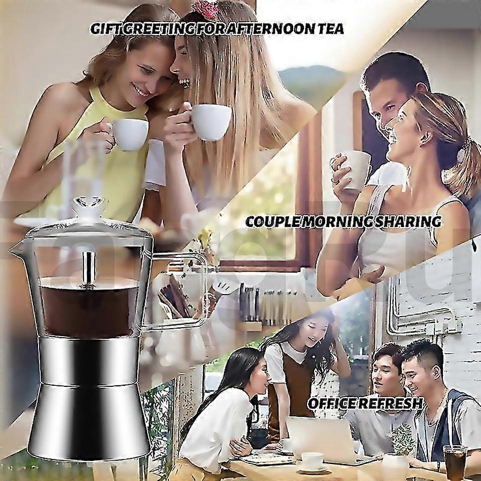 Fangrui Product Details The glass allows you to check the condition of your espresso for better control over your espresso. food grade stainless steel can make our moka pot healthier. This stove top espresso moka pot can be heated on different appliances including induction, ceramic, gas and electric. Health and safety is our primary concern, the heat- handle is made of heat-, providing full protection for your hands. The water line cannot exceed the safety valve. After the coffee is brewed, please stop heating the coffee pot within one minute to avoid scalding the bottom of the mocha coffee pot! This Italian coffee maker is the for friends, family and anyone who loves great Italian coffee. capacity: 240ml Material: Stainless steel colour: transparent+silver Package Contents: 1 x Moka Pot Only the above package content, other products are not included. Note: Light reflection and different displays may cause the color of the item in the picture a little different from the real thing. The measurement allowed error is +/- 1-3c