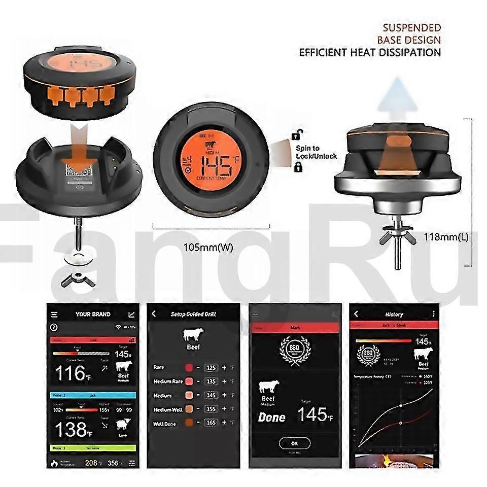 Fangrui Product Details Features: 1: Detachable design, can be used in combination or alone 2: Can support 4 probes at the same time 3: Use an oven thermometer Color: Black Material: ABS+ stainless steel Product Name: Bluetooth Barbecue Thermometer Temperature range: Monitoring temperature: 0℃~ 380??? 32℉~ 716??? Wireless Range: Outdoor 50m/164ft without obstacles; Indoor: 30m/100ft Display method: LCD screen and application Alarm function: maximum and minimum temperature alarm Alarm range: time countdown alarm Temperature setting: raw, medium-rare, medium-rare, the temperature can be set for different cooked foods. Waterproof: IP54 Material: ABS shell + 304 stainless steel probe Battery: 2 x AA batteries (not included) Usage: It can be used for , Kamado grill, smoked charcoal Wide application: chicken, ham, turkey, pork, beef, roast, oven, smoker, roast, food Support smart devices: For 4S and above models. 5, 3rd generation and later models. All mini. Android device running version; 4.3 or higher, with Bluetooth 4.0 module