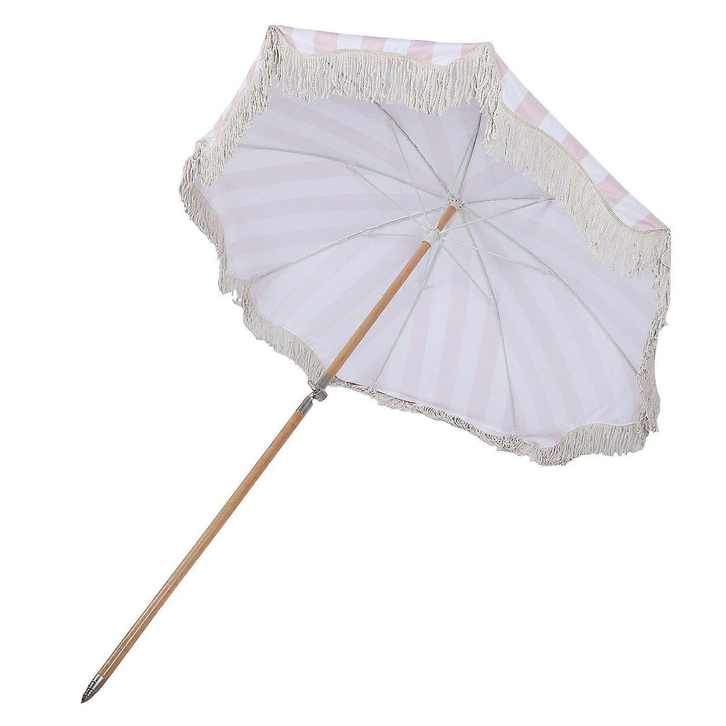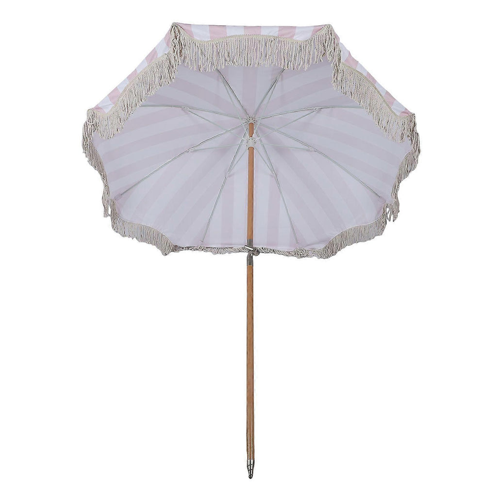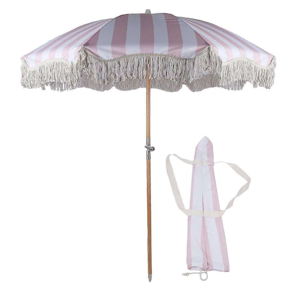 Features 1??Stable and Secure: Constructed with 8 fiberglass ribs and a wooden pole, the patio umbrella is more stable and safe. The stylish brown powder coated finish and built in sand anchor at the bottom provide excellent stability. 2??UV Proof: Made with premium polyester fabric featuring a PA coating, this outdoor umbrella offers UPF 50+ prevention and blocks 99% of UV rays. It can also be adjusted to tilt for maximum sun coverage, ensuring your skin's safety while enjoying summer at the beach. 3??Stylish Design: The simple yet fashionable color combined with elegant tassel design not only meet your UV proof needs at the beach but also serve as a beautiful decoration for your garden or the perfect backdrop for sharing photos with friends. 4??Easy Assembly and Portable: The table umbrella consists of 2 parts for easy assembly, and it is lightweight and compact, comes with a carry bag for easy transportation to any desired location. 5??Large Size: With size of 215x180cm, this patio umbrella provides ample coverage. Remember to tighten and secure the umbrella when not in use, especially during strong winds or rainy days, to prolong its lifespan. Specifications Item Type: Patio Umbrella Material: Polyester Fabric, Beech Wood, Aluminum Weight: Approx. 4400.00g/155.21oz Product Size: Approx. 215x180cm/84.6x70.9in Package List 1 x Patio Umbrella 1 x Storage Bag