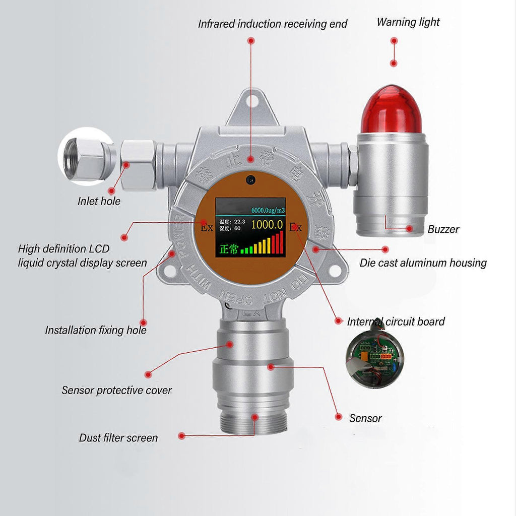 Feature:1. REAL TIME ACCURATE DISPLAY: Two wire 420mA signal and RS485 digital signal output, capable of real time communication with computers. Adopting high speed and good accuracy processing circuits to achieve fast and accurate instrument measurements.2. EASY TO USE: Large screen LED display, function arrowhead indication for easy operation. Equipped with infrared remote control, parameter adjustment can be achieved without opening the cover. Full range temperature digital compensation. Remote control or buttons enable the detector to be freely configured on site, such as viewing, setting, and calibration.3. STRONG COMPATIBILITY: The instrument outputs various standard signals and can be compatible with various alarm systems, PLC, DCS and other control systems.4. EASY TO MAINTAIN: Plug and play international standard intelligent sensors, explosion proof housing design, on site maintenance is safe, convenient, and fast.5. APPLICABLE SCENARIO: The instrument is widely used in petroleum, chemical industry, metallurgy, fire protection, coal mine, power, ship, environmental protection, telecommunications, medical and other industries.Specification:Item Type: Combustible Gas DetectorMaterial: Die Casting AluminumDetection Range: 0 to 100 percent LELDisplay Method: LED displayDetection Accuracy: 3% F.SLED Display Content: Measured gas name, real time numerical value, 50 segment bar chart display in real timeGas concentration, gas full scale, gas internal parametersLED Display Mode: ppm, ppb, mg/m3, ug/m3,% VOL,% LELWorking Environment Temperature: -20 to 50 Working Environment Humidity: 10 to 95% RH non condensingSignal Output:4-20mA Signal: Standard 12 bit accuracy 4-20mA output chip, transmission distance 1KmRS485 Signal: Using standard RTU protocol, transmission distance 1KmInput Voltage: 100-240VWorking Voltage: 24VDC (12-30VDC)Battery: CR2025 button battery x 1 (remote control shipped without battery).Package List:1 x Tester 1 x Plug Adapter 1 x Interface 1 x Remote Control1 x Accessory 1 x Manual