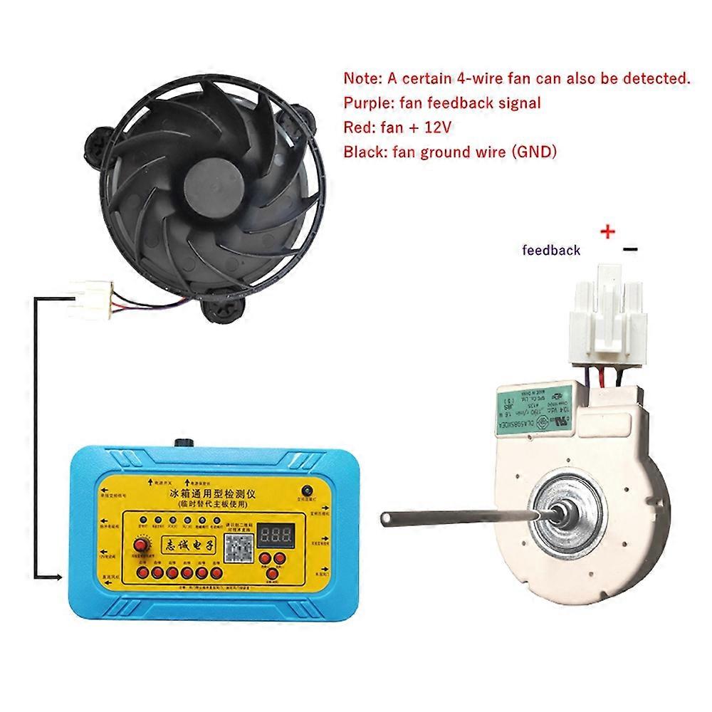 Product Overview: This professional-grade multifunctional refrigerator tester is designed to evaluate and troubleshoot various components in refrigeration systems, including inverter boards, compressors, and other electrical components. Key Features: Application: Suitable for testing single and dual signal inverter boards, inverter compressors, single and dual dampers, pulse solenoid valves, 12V electrical switching valves, and DC-fans. Output Voltage: Available in 220V or 110V options. Electrical Throttle Detection: Connection: Attach the damper detection line to the damper motor interface, following the red, yellow, blue, and white sequence as shown in the diagram. Operation: The default setting is for single damper detection. Press the damper button; the damper indicator light will illuminate, and the display will show "176". When the damper is fully open, the light will turn off. Press the button again to close the damper; the display will show "176", and the light will turn off when fully closed. If the damper opens and closes smoothly, it indicates normal operation. If there is no movement or smooth operation, it suggests a malfunction. Package Includes: 1x Detection Kit