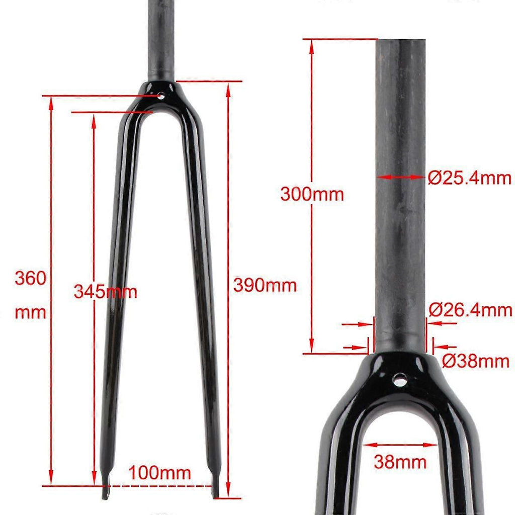 Description: Premium Material: This road bicycle fork is made from carbon fiber, ensuring its durability and lightweight feature for a smoother ride.Specifications: The vertical tube outer diameter is 25.4mm/1.00inch, the installation bottom bracket diameter is 26.4mm/1.04inch, and the front fork opening is 10cm/3.94inch.Professional Design: The bike front fork features scientific structure combined with carbon fiber enhances maneuverability while riding. Wide Application: This bicycle fork is universal for most bikes, great for outdoor bicycling, biking, riding, etc.Package Includes: Each package comes with 1 carbon fiber road bike fork, a great replacement front fork for repairing and maintenance. Specification: Material:?Carbon Fiber Size Chart: The outer diameter of the vertical tube is 25.4mm/1.00inch, the diameter of the bottom stop is 26.4mm/1.04inch, and the front fork is 100mm/3.94inch. Package Includes: 1?Road Bike Fork Note: Please allow slightly errors 1-2cm differences due to manual measurement.