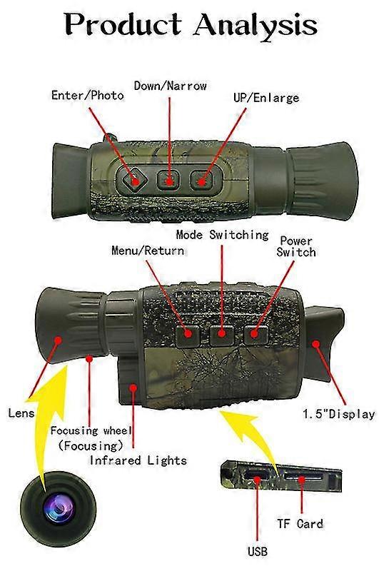 Specificationsl Picture size36MP/32MP/30MP/24MP/20MP/16MP/12MP/10MP/8MP/5MP/3MP/VGAl Video size: 4K/2K/1088P/1080P/720P/VGA/QVGAl Aperture: F 1.2 f=25mml Lens: FOV=10, diameter 25mml Display: Internal 1.5(480*240) HD TFTl Digital zoom: 5xl Storage medium: TF card, up to 128GB (not included)l All black viewing distance: 150-200Ml Low light or daytime viewing distance: 3 meters to infinityl Infrared light: 3W, 850nm, strong infrared spotlight, 7-speed infrared adjustmentl USB interface: MICRO USB 2.0l Power supply: built-in 2000mAH lithium batteryl Operating temperature: -20 to +60l Storage temperature: -30 to +70l Product size: about 150*70*46mml Product weight: about 160g