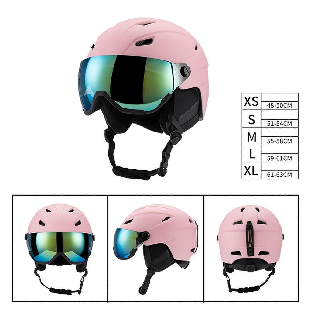 Description: Integrated Design: Pink Snowboarding Helmet is integrated designed with protection goggles, windproof, enhances vision and protects eyes from adverse weather conditions during ski adventures Ski Accessories: High Impact Protectived ski helmet, shock absorption, minimize impact force and improve overall safe Reliable Material: Snowboard Helmet features with eps liner, high impact pc shell, designed with breathable hole and comfortable removable inner liner Adjustable Strap: Designed with adjustable strap and jaw pad to ensure a safe and comfortable fit, suitable for both men and women Wide Use: Snowboard Helmet is great for outdoor winter sports, such as skiing, snowboarding, skateboarding, skating, snowmobiling, snowboarding, mountaineering and more Specification: Material: EPS and PC Size Chart: Head Circumference (Optional) :S: 51cm-54cm/20.08inch-21.26inchorM: 55cm-58cm/21.65inch-22.83inchorL: 59cm-61cm/23.23inch-24.02inchorXL: 61cm-63cm/24.02inch-24.8inch Package Includes: 1Skiing Helmet