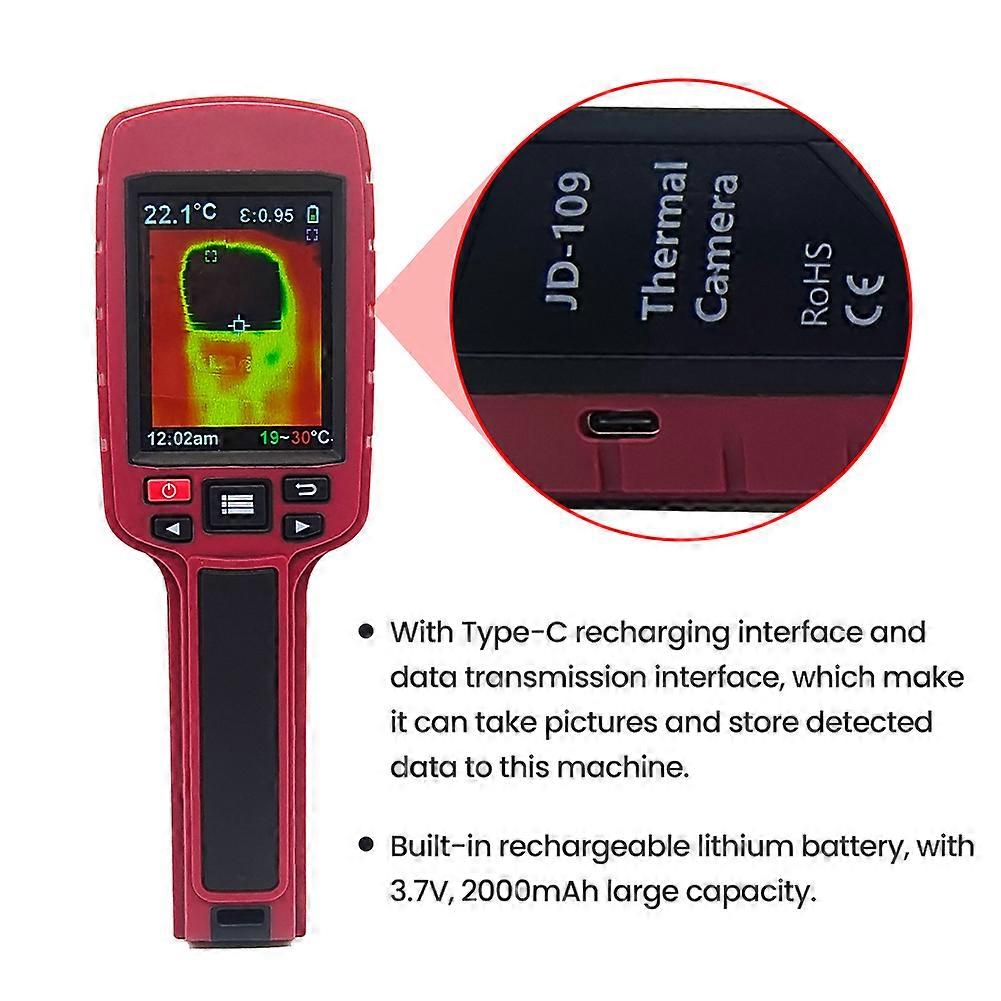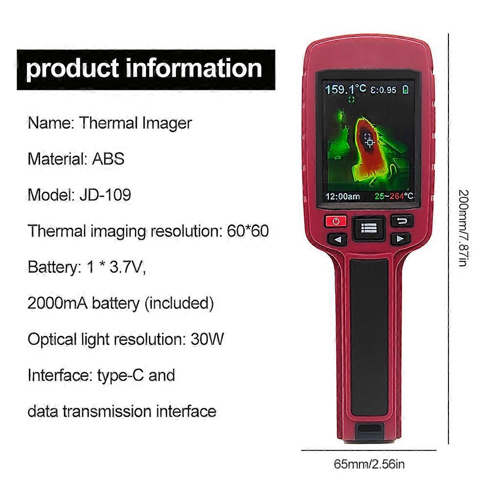 This is a thermal imaging camera that combines surface temperature measurement and real time thermal imaging. The thermal imager is effective in converting thermal radiation imaging into visible light imaging. It is mainly used for residential office and production electricity maintenance, electrical switch temperature detection, and so on. Features: This product is combine the functions of surface temperature measurement and real-time thermal imaging, suitable for both human temperature detection function and industry temperature detection function. Large color screen, with 60*60 infrared pixel, 5mega visible light pixel, you can see the data clearly. The screen shows the highest temperature, the lowest temperature, emissivity, time, electricity quantity and imaging. Five color palette modes adjustable, you can set according to your demands. Equipped with photograph shoots and data leading-out functions. Support biological temperature measurement mode, the temperature measurement error is ±0.4. Temperature unit switchable design, you can switch to or according to user demands. With Type-C recharging interface and data transmission interface, which make it can take pictures and store detected data to the computer. Support set timer shut off time, support set time and date, support set max/min alarm value. Built-in rechargeable lithium battery, with 3.7V, 2000mAh large capacity. Applications: Installation and maintenance of floor heating, radiator and water heater. Residential office and production electricity maintenance, electrical switch temperature detection. Small animal searching and investigation in buildings (including termite control). Car repairs and maintenance inspection, automotive parts temperature detection. Specifications: Name: Thermal Imager Material: ABS Model: JD-109 Display: 2.8inch Battery: 1 * 3.7V, 2000mA battery (included) Thermal imaging resolution: 60*60 Visible light resolution: 5mega pixels Field of view: 66°*66° Thermal sensitivity: 0.15 Temperature measurement ranges: -20 to 500 Accuracy: ±2 or ±2% (larger value) Emissivity: 0.1-0.99 Capture frequency: 9Hz Wavelength ranges: 8m-11.5m File format: bpm Operating temperature: 0-40 Storage temperature: -20 to 60 Storage humidity: 10-85%RH Interface: type-C and data transmission interface Item size: 205 * 70 * 53mm / 8.07 * 2.76 * 2.09in Carrying bag size: 65 * 122 * 222mm / 2.56 * 4.80 * 8.74in Item weight: 574g / 1.27lb Package size: 247 * 137 * 75mm / 9.72 * 5.39 * 2.95in Package weight: 865g / 1.91lb Packing List: 1 * Thermal Imager 1 * Type-C Cable 1 * Manual