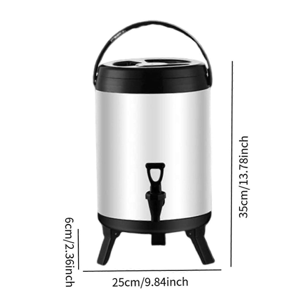 Description: Insulation: Low thermal conductivity, the effect of heat preservation and cold preservation is very be used to hold all kinds of delicious milk tea, coffee, juice, etc. Notes: Only Physical Insulation, NO HeatingStainless Liner: The Beverage Dispenser liner is made of food grade stainless steel precision material. It is double insulated and can keep warm for 8-24 hoursConstruction: The Insulated Barrel 2.5cm thick insulation layer is complemented by a stainless steel rolled edge design on both the inner and outer surfaces of the containerResin Faucet: The two stage faucet is made of food grade resin. It can withstand high temperature and long time pull and release, not easy to breakInnovative Lid: Bucket cover with anti skid design, more heat preservation, can be rotated and tightened to prevent water overflow. Great for Home Party Use Size Chart: diameter 25cm/9.84inch, inner diameter 19.5cm/7.68inch, height 30cm/11.81inch, inner height 20cm/7.87inch, capacity 5.5kg Package Includes: 1 Insulated Barrel