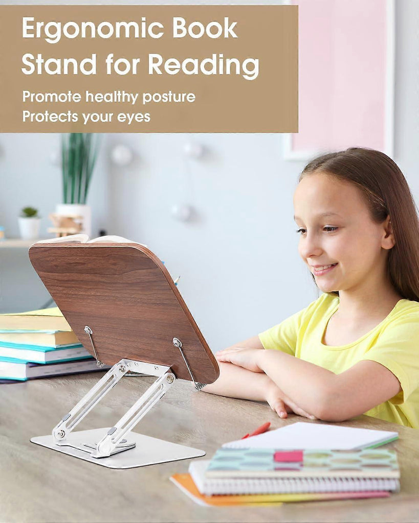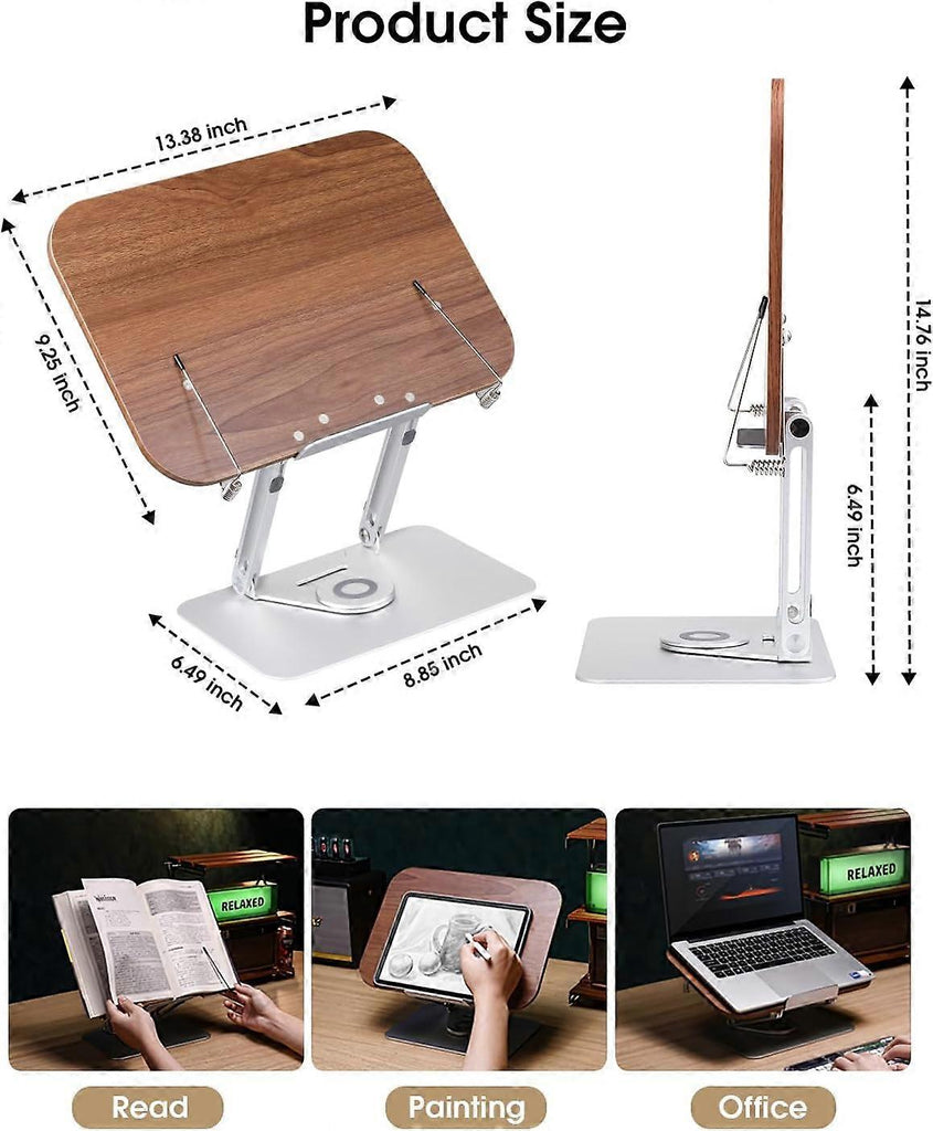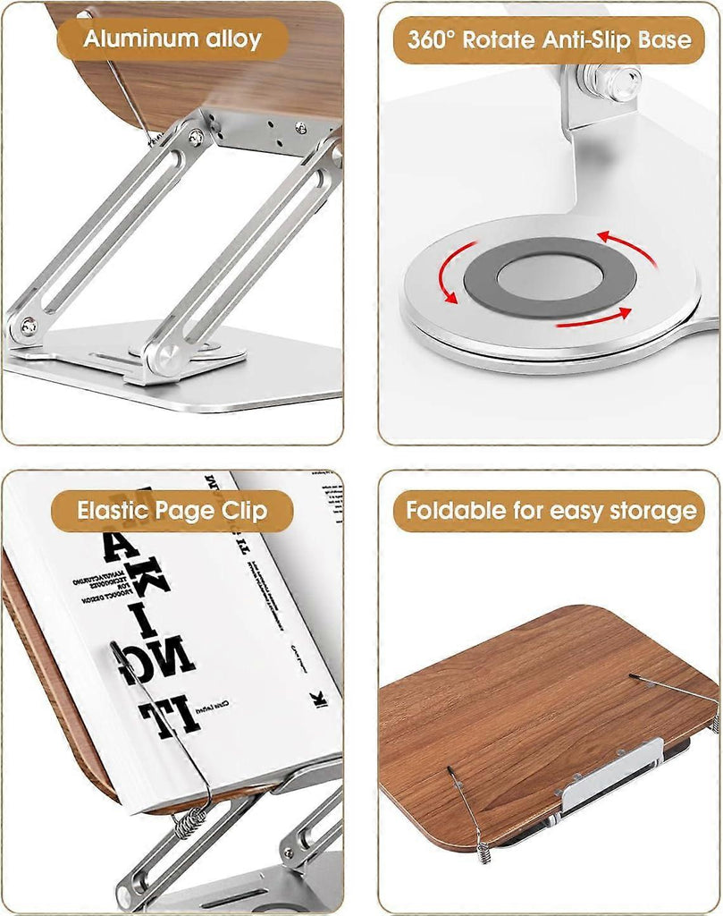 Adjustable Book Holder with 360 Degree Rotating Base Page Clips, Foldable Desktop Stand for Documents, Cookbooks (Wood)