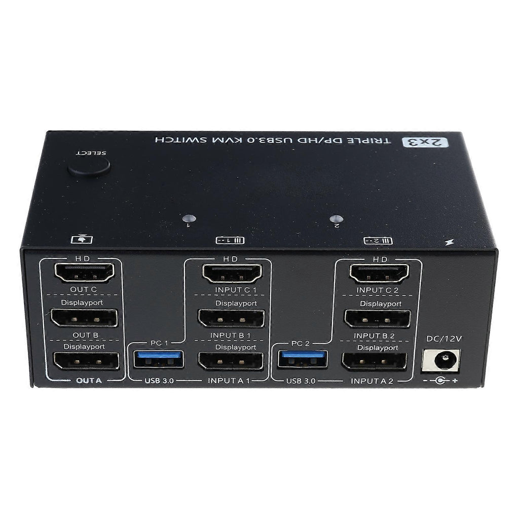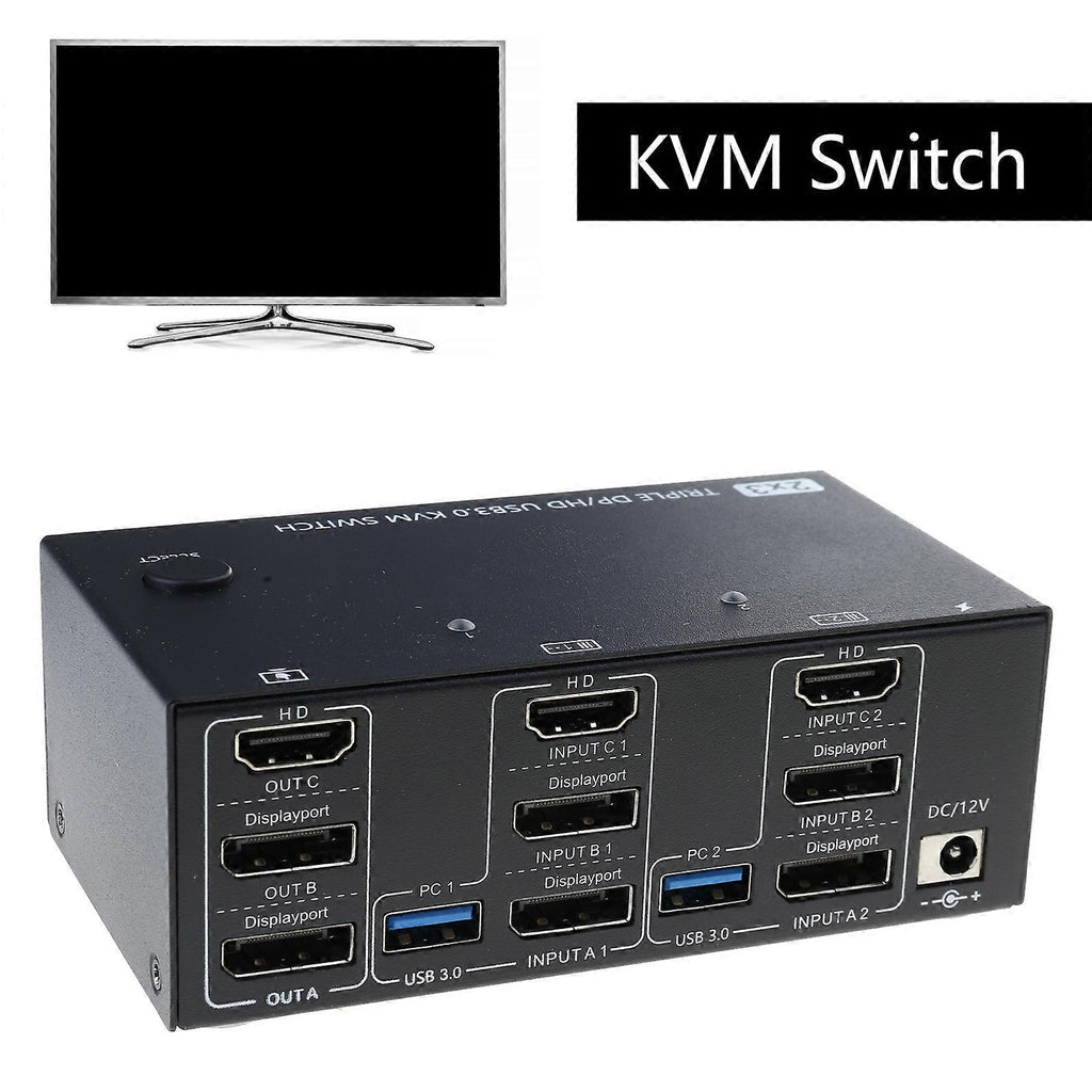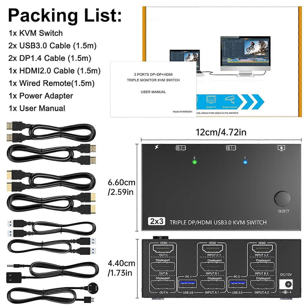 Features: This USB & HDTV+2xDisplayport KVM switcher can control 2computers or laptops, share 3 monitors and 4 USB3.0 hubs. Supports multiple display modes (extended, mirrored and splicing wall). It is the best KVM switcher to improve your productivity and make your workspaces tidier for work and home. Triples monitors output support extended, mirrored and splicing wall display. HDTV 2.1 Compatible input and output port. Displayport1.4 Compatible input and output port . Specifications: Component:Metal Size:Approx.12x6.6x4.4cm/4.72x2.59x1.73inch Supports Displayport video resolutions up to 4K@144Hz Supports HDTV video resolutions up to 4K@60Hz,8K@60Hz Support Deeply Color Switching modes:Physical button and wire remote High compatibility, can auto-matching source and display device Builts-in automatic adjustment systems, make the picture smooth, clear and stable Builts-in ESD protections systems Package Includes: 1pc KVM Switcher 1pc Power Adapter 1pc Wire Controller(1.5m/4.92ft Cable) 2pcs USB3.0 Cable(1.5m/4.92ft Cable) 2pcs DP1.4 Cable(1.5m/4.92ft Cable) 1pc HDMI2.0 Cable(1.5m/4.92ft Cable) 1pc Manual note: Please allow 1mm errors due to manual measurement. Due to the differences between different monitors, the picture may not reflect the actual item color.