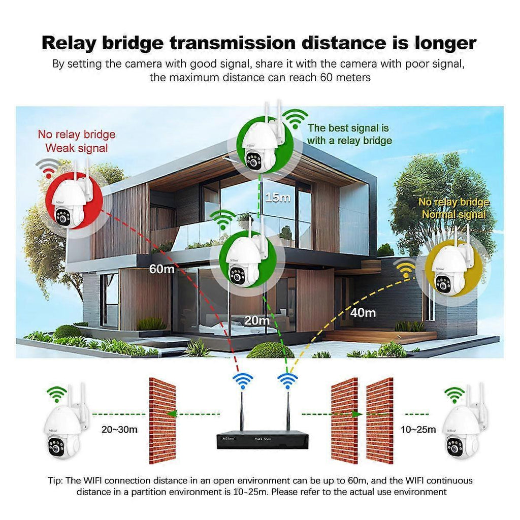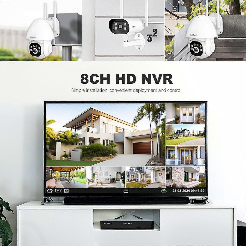 SriHome NVS001E-IPC039B 5MP 8CH HD NVR Wireless Cameras Set 1. 5MP Wireless NVR kit with 4 pcs 5MP cameras 2. NVR supports up to 8CH 5MP wireless cameras 3. Supports up to 16TB HDD storage and playback 4. Supports wireless bridge mode - WiFi range up to 60 meters 5. Supports H265 compression format, 1TB storage for about 30 days 6. Supports 2-way audio, infrared dual light, full-color night vision 7. AI intelligence: supports human tracking (PTZ cam), Siren alarm 8. Supports mobile phone remote monitoring, intercom, playback 9. Waterproof IP66, indoor and outdoor