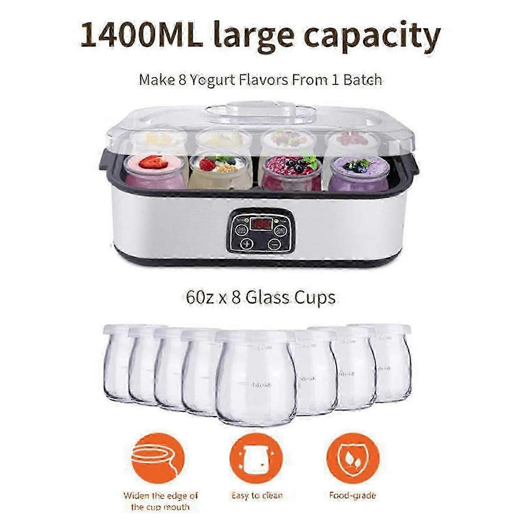 Features 1. The yogurt maker has a large capacity of 1400ML, enough for a family to enjoy. 2. The yogurt machine has a constant temperature fermentation function, making yogurt more rich and delicious. 3. It can not only make yogurt, but also make milkshakes, jams, ice cream, and other delicious dishes. 4. The yogurt maker is made of stainless steel material, which is safe, hygienic, and durable. 5. Breakfast set, versatile, adding more choices to your healthy breakfast. Specification Name: Yogurt Machine Power: 25W Weight: 2.4 kilograms Voltage: 110-240V Color: Silver Packaging size: 36.8 x 19 x 14.5cm Package Include: Yogurt machine x1