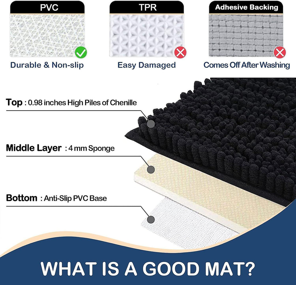 describe: [Ultra-soft plush] The luxurious bathroom rug has a soft and comfortable feel and provides superior comfort and support. Soft down will soothe your tired feet and protect your toes from the cold of the ground. 1 inch (approx. 2.5cm) high soft microfiber, unique fiber locking technology, softer, thicker and better textured than ordinary chenille. Every time you step out of the shower or bathtub, you will enjoy exceptional comfort as if you were on a cloud. [Fast Absorbency] Our gray bathroom rugs are made up of thousands of individual 1 -Inch ultra-soft microfiber pile. The thick chenille fabric absorbs water quickly, helping soil sink in front of pots, showers or sinks. Moisture is trapped in the high pile of the rug, so the bathroom rug dries quickly. [Non-slip PVC backing] The aromatic chenille bathroom rug has a non-slip sole made of high-quality mesh PVC -Material that prevents the bathroom rug from moving and slipping, protecting you and your family from possible slips or falls in the bathroom. The middle layer is made of 4mm thick memory foam, which feels more comfortable in the pillow. WARNING: Only place the bath mat on a clean and dry surface. Submerging a bathroom rug in water can cause it to slip. Always keep the bottom of the bath mat dry. [Machine washable and dryable] These chenille bath mats are easy to clean. Machine wash in cold water and mild detergent, tumble dry low or hang to dry. The color of the bathroom carpet will never fade even after many washes. The ultra-soft microfiber material does not shrink or feel rough even after washing, so your bathroom rug will stay beautiful for a long time. [Build your bathroom oasis] Our mats are in Available in many colors and sizes and can be widely used as bathroom mats, shower door mats, bathtub side mats, kitchen mats or simply placed in front of the sink or in the living room, bedrooms, hallways, entrances, balconies, sand wool, car seats. As long as you want to support and warm your toes, this pad and pillow can be placed anywhere in the house and also be a perfect decoration for the whole family!