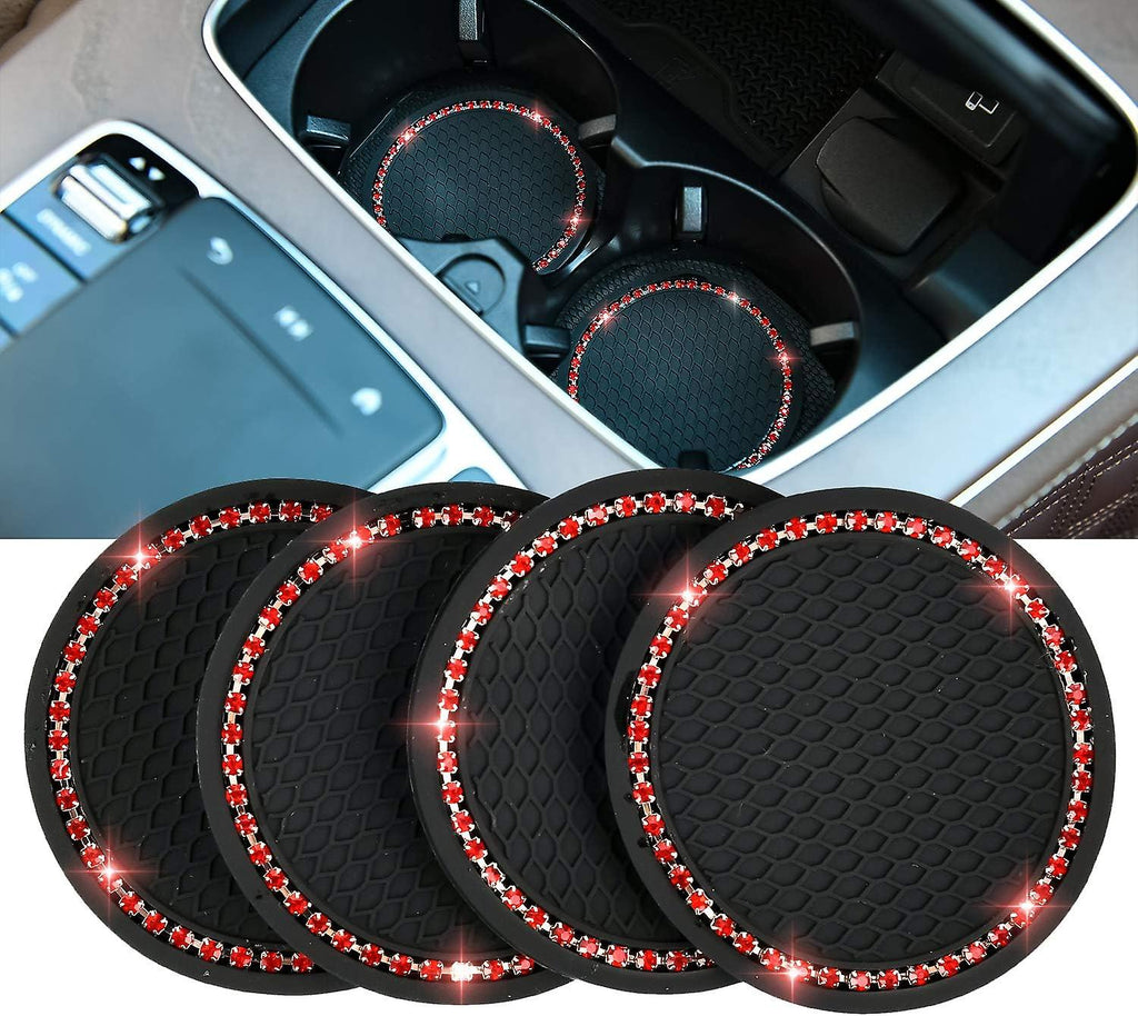 (black big red diamond) Set Of 4 Glitter Car Coasters, Universal Vehicle Glitter Car Accessories - 2.75 Inch Non-slip Silicone Crystal Rhinestone Car Cup Holder, 4 Pieces (bl