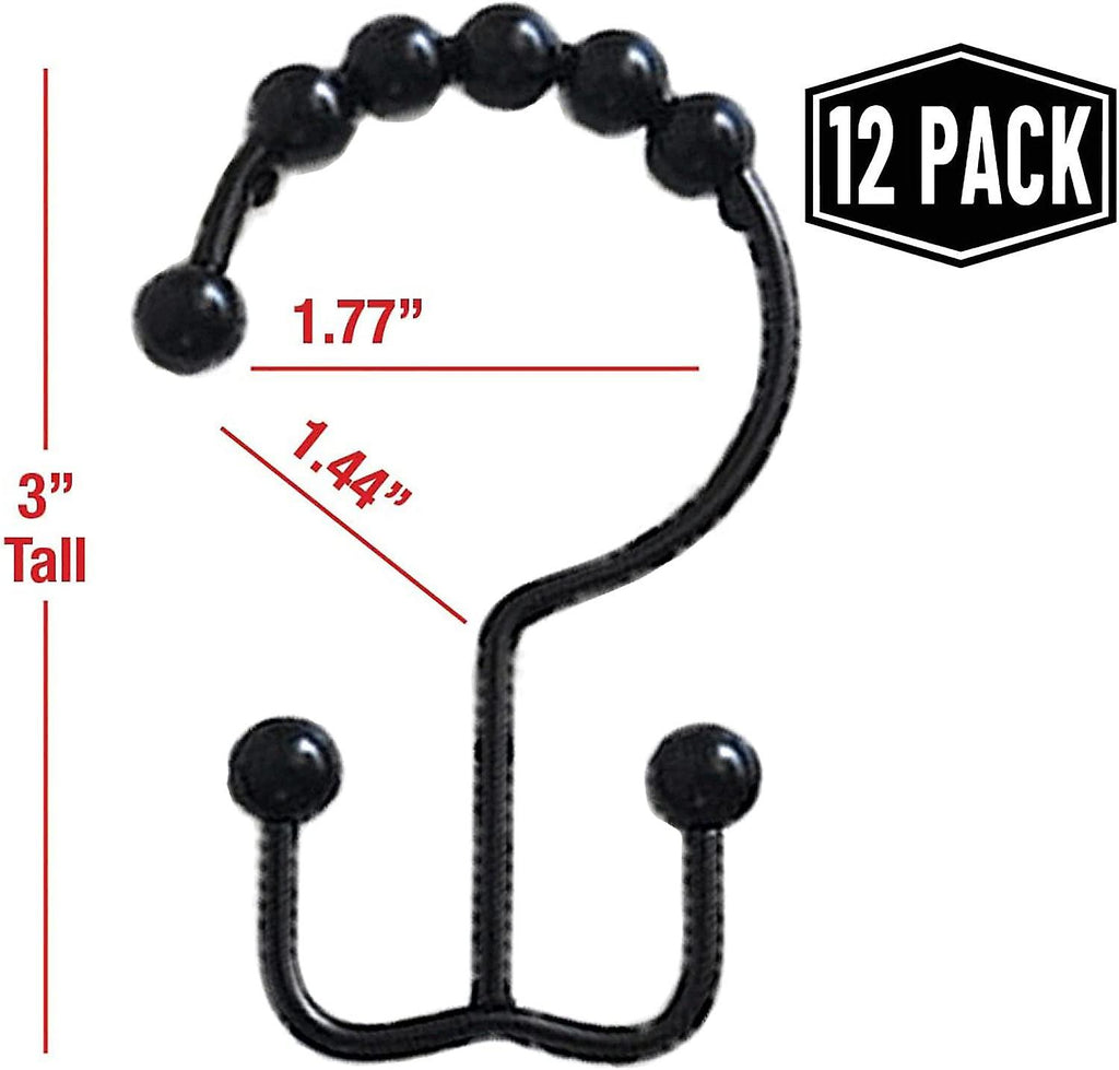 describe: EASY TO USE: With these shower curtain rings you can easily hang or remove shower curtains and liners. Installation only takes a few minutes and the unique design prevents them from falling out. The shower curtain rod with hook roller and ball glides smoothly and quickly on the shower rod. Double hook design: The double bearing sliding shower curtain hooks are strong enough to hold shower curtains and bathroom liners. Double sliding shower curtain hooks allow you to hang shower curtains and shower liners separately. HIGH-QUALITY METAL: Made of durable, sturdy and long-lasting metal material, it holds sturdy curtains and liners perfectly. These shower curtain hooks are made of high quality metal material and have anti-rust coating. They are durable and long lasting. Smooth sliding function: There are five special rollers on each hook that allow the shower curtain rod to slide easily without rubbing the shower rod. These shower curtain hooks prevent snagging and opening and closing of the shower curtain liners. SET OF 12: These double shower curtain hooks are sold in a set of 12 shower curtain rings. Most of the quantitative needs of ordinary bathrooms are met. Fits all standard size shower curtain rods.