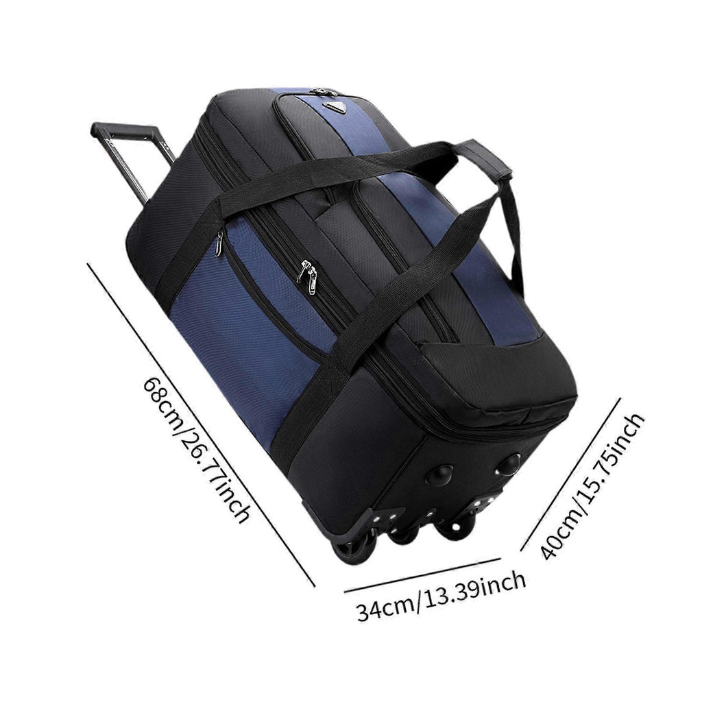 Description: Quality Material: This Travel Duffel Bag is made of quality Oxford cloth, which is sturdy, wear resistant, and waterproof, ensuring long term use.Large Capacity: This Rolling Luggage has a large capacity with multiple compartments and smooth zippers, providing you with ample storage space for easy access to your items.Easy to Use: This Wheeled Suitcase comes with a retractable handle, double sided zippers, and sturdy handles for easy transportation and movement.Multifunctional Application: This Rolling Garment Bag is suitable for various occasions such as travel, business trips, camping, outdoor activities, gym workouts, etc.Practical Gift: Weekend Bag makes a practical gift for men and women alike as well as family or friends. Specification: Material:?Oxford Cloth Size Chart: 40cmx34cmx68cm/15.75inchx13.39inchx26.77inch Package Includes: 1?Wheeled Travel Duffel Bag Note: Please allow slightly errors 1-2cm differences due to manual measurement.