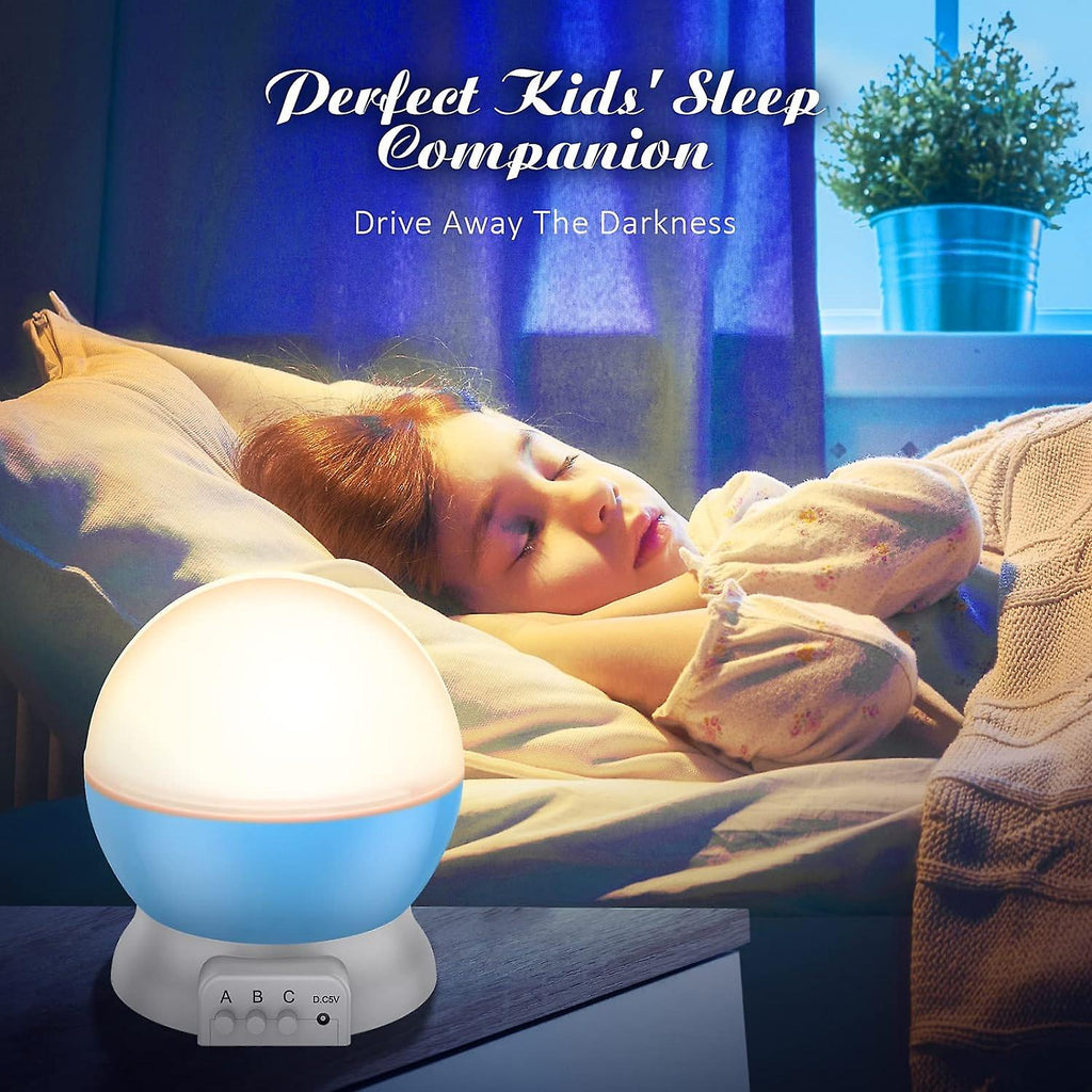 describe: Star and Moon Night Light Projector: The night light looks amazing and takes children into the vast universe where they can admire the colorful moon and stars, that fly through space. Have fun with the sky, satisfy your curiosity and develop limitless imagination. 8 Color Changing Modes: Built-in 4 upgraded LED beads, more colors and longer lifespan. 360 degree rotation, presenting a dreamy moving starry sky. Sleep Light: With a dome-shaped cover, this star projector can be used as a night light, emitting a soft, warm white light and works without noise or light. Chase the darkness in the Chamber of Secrets and quickly lead yourself into a deep sleep. 2 power and child lock modes: The night light for children can be powered by 4 AAA batteries (not included). Included) or a USB cable. However, the two performance modes cannot be used at the same time. Made from non-toxic materials, our night lights can be taken anywhere with kids and provide a warm glow as they walk down the hallway to the bathroom and back IDEAL GIFT FOR KIDS: Great Gift for boys and girls for birthdays, Christmas, Valentine's Day and Children's Day. The 360 degree rotating star lighting is an ideal decoration for parties, birthdays, New Year's Eve and other occasions, creating a warm and romantic atmosphere.