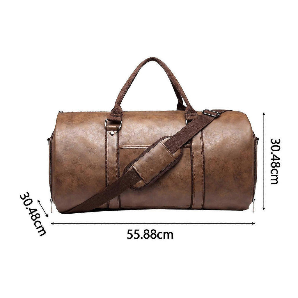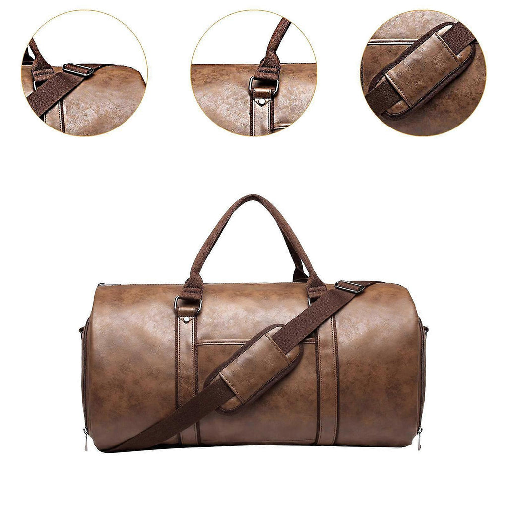 Description: QUALITY MATERIALSThis duffel bag is made of quality PU leather and polyester lining, preventing wear and tear, ensuring durability, and easy to clean.MULTIPURPOSEIt can be used as a traveling bag, gym duffel bag, sports duffel bag, overnight bag, suit bag, carry on luggage bag for men and women, making packing efficient and organized.GARMENT BAGThere are hanging loops inside to keep the garment flat without side movements during the trip and without wrinkle troubles of your dress or suits any more.FEATUREThe leather travel duffel bag has a luggage bar slot on the back to easily fix the travel bag on the luggage rod, which is more relaxed, with separate shoe compartment, which can hold shoes separately.APPLICATIONThe luggage suit bag has a detachable and adjustable shoulder strap specially designed for long time travel, business trips, and weekend trips. Specification: Material: PU Leather, Polyester Size Chart: 55.88cmx30.48cmx30.48cm/22inchx12inchx12inch Package Includes: 1 Duffle Bag Note: Please allow slightly errors due to manual measurement and different monitors.