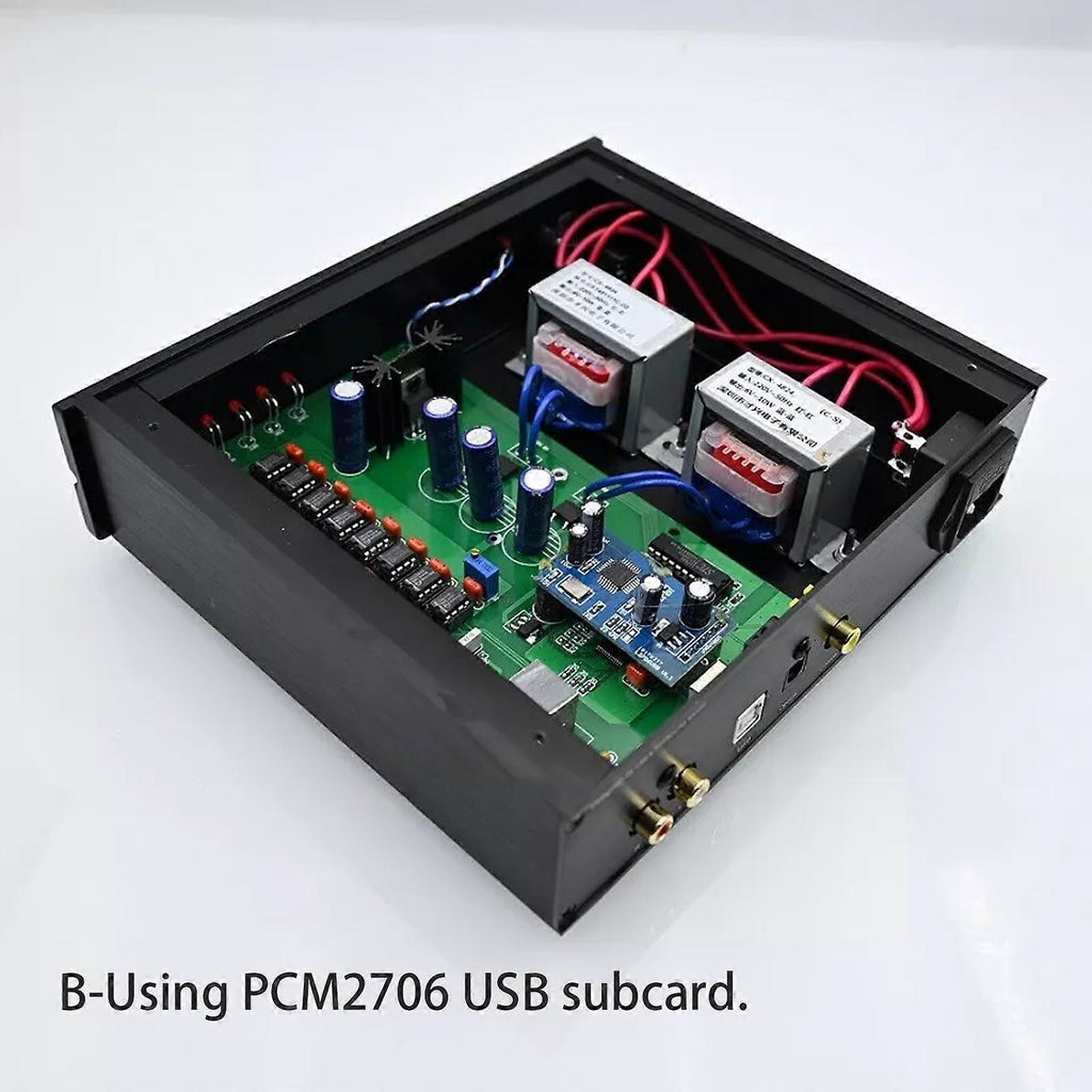 Bundle 1 Bundle 1 does not have USB input function. Bundle 2 Using PCM2706 USB subcard. PCM2706 USB is stable and mature. Not using HOST power supply method, the power supply is stabilized to improve stability. An active crystal oscillator provides a stable clock. SPDIF output level waveform shaping. Support frequency: 44.1K, 48K Bit width: 16 bits. Bundle 3 Using CM6631 24Bit 192K USB asynchronous subcard. Product Details: Use two transformers to supply power. Digital part and analog part of the independent power supply, the sound more clean. Using 16PCS TDA1543 decoder chip Parallel connection. Using PCM2706 or CM6631 USB subcard. (Bundle 1 does not have USB) Using aluminum chassis. Active crystal provides a stable clock. SPDIF output level waveform shaping. Specifications: Digital input: coaxial, fiber, USB Analog output: RCA analog output. Digital input bit rate: 44.1K -96K. Analog output level: 3.2Vrms. Power supply: AC110V or AC220V. (Optional) PCM2706 USB support frequency: 44.1K, 48K, Bit width: 16bit. CM6631 USB support frequency: 192K, Bit width: 24bit. Volume: Width 220MM * High 52MM * Deep 191MM Weight: 2.8KG Package list: 1 Finished TDA1543 USB Decoder