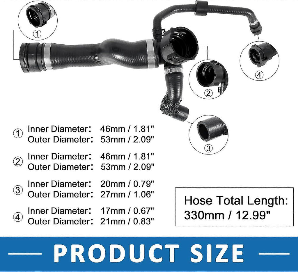 1.Replacement For OE Number 17127580957; suitable for BMW 535i 20112016 2.Function Radiator coolant hose pipe direct replace the broken or shabby hose.Ensure the smooth operation of the water pipe and achieve the cooling effect 3.Material Radiator vent hose is made of rubber material which has the advantages of elasticity, wear resistance, and cold resistance. 4.Installation Easy to install and replace the broken engine radiator coolant hose pipe, no special tools needed.