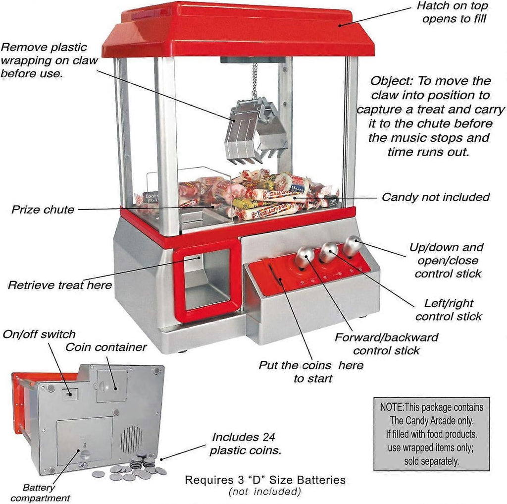 1.FUN Kids of all ages love the claw machine games at arcades, carnivals, and fairs. Now you can bring all that fun straight into your home with this mini claw game machine! Endless hours of fun right in your living room! 2.EDUCATIONAL Claw machine toy is not only fun, it also helps your child build fine motor skills, hand eye coordination, encourages creativity and problem solving. 3.PRIZES Put some small items into the machine and then put in a coin to start the game! Pretend coins are included. Items for use as prizes are not included. Claw machine measures 13'H x 7'W x 8'L. Batteries are not included. Comes with music and flashing lights when playing. 4.SAFE Made out of and non toxic material so you have nothing to worry about. Easy to carry claw machine game lets you take the fun anywhere you go! Perfect for rewarding your child whenever they perform good deeds!