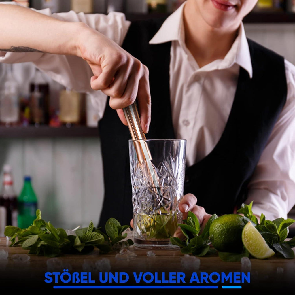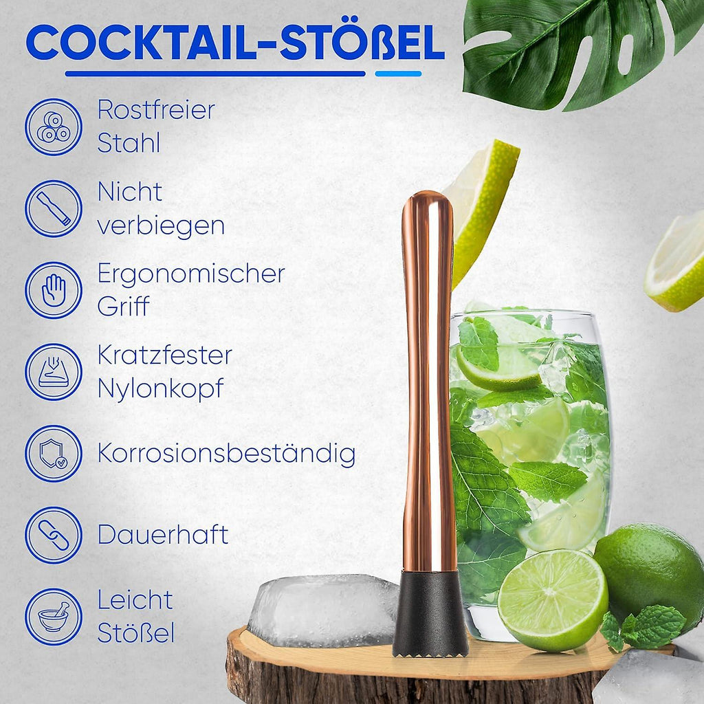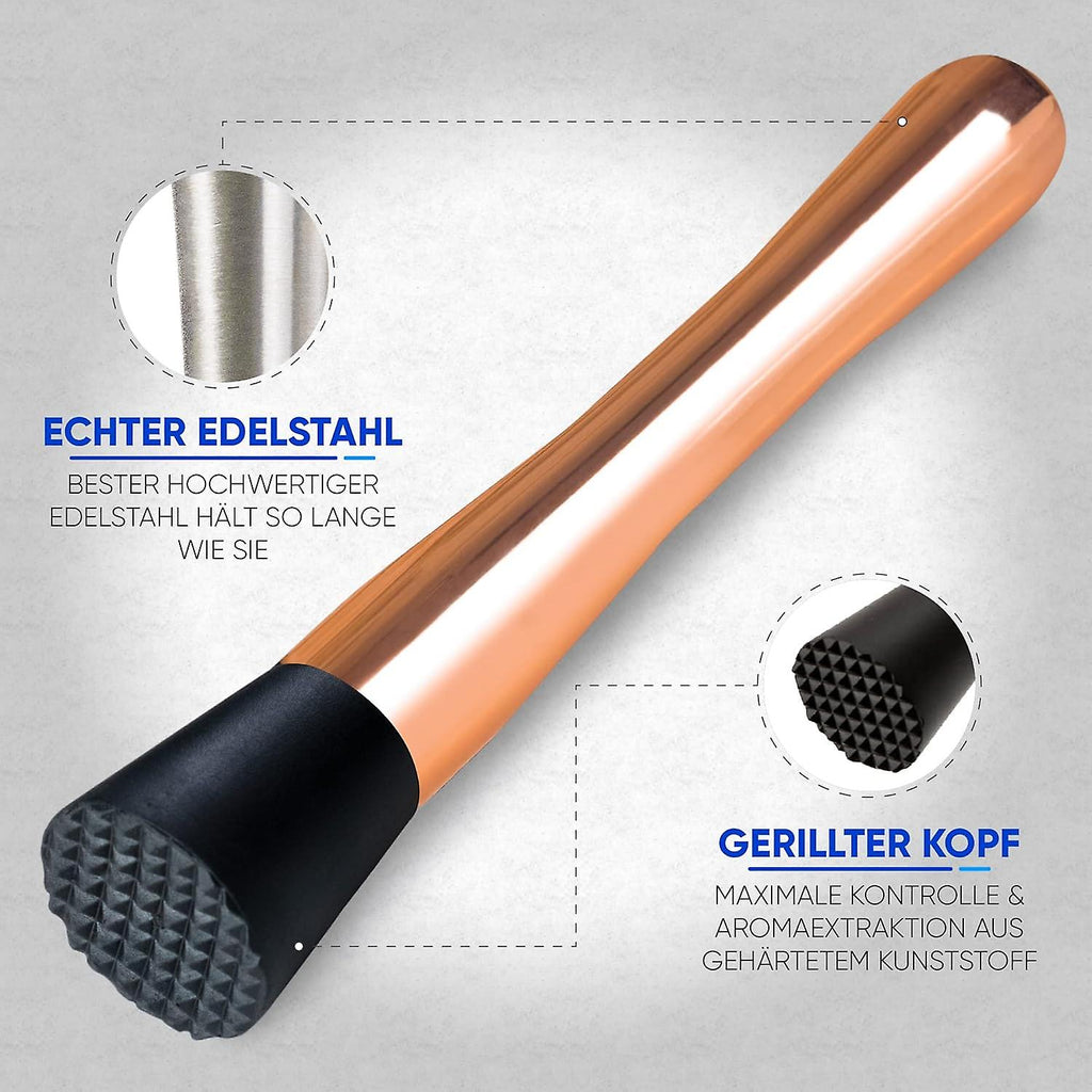 Product - You will receive a professional bar accessory that allows you to mix and puree ingredients. For example, the fluted tip of the masher ensures that the lime does not jump out of the glass during preparation and can be crushed more easily. Bar Tool - This product is ideal for preparing cocktails such as Capillinas and liqueurs . The serrated head is made of plastic suitable for raw food and chops fruit, mint, lemons, sugar, ice cubes and herbs. Design - The seamless processing of the piston makes it less susceptible to dirt and wear. Washes easily with hot water. DETAILS - The rounded end of the stick fits perfectly in the palm of your hand, making it more comfortable to use. Stosur is rust-resistant and dishwasher safe. Materials and dimensions - stainless steel, 20.5 x 3.5 x 3.5 cm