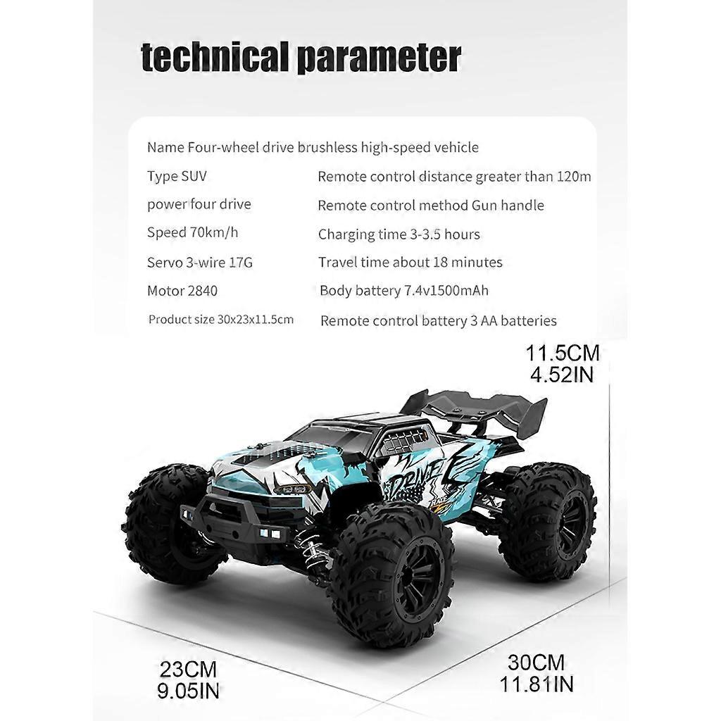 Features: Remote Control Off-road Car: Unique workmanship makes this simulation toy like a real off-road car, scale of 1/16, high speed & powerful brushless motor, restore the real driving experience and infinite imagination with fun of for play, can move forward, reverse, left & right turn, all terrains, super realistic. Qualification Material: The rc desert off-road car made of qualified ABS body, alloy strong support,and electronic component,anti-rolling & great grip tire traction.ensure the stability and make sure the toy could operate easily. Easy to Charge: Attached USB charging cable to connect and charge easily, and the 2.4GHz remote control which is easy to operate and sensitive controlling, four wheel drive with perfect for play experience. Flexible RC Crawler Car: The RC crawler truck car can run freely with powerful motor, flexible with four wheel drive on the smooth or rough roads, speed can upto 43mph, rubber tyres ensure sufficient and strong grip while driving, anticollision antirolling design it easier operate. Great Gift: A great birthday or Christmas gift for kid & adults,with great attraction especially in party games, outdoor for play, also an awesome collection for RC hobbyists. Specifications: Color Option: Green/Red/Blue/Orange Product Dimension: approx. 30 x 23 x 11.5cm/11.for 81 x 9.05 x 4.52 inch Net Weight: approx. 1700g/3.74 pound Remote Controller Power Supply: 3 x AA batteries(NOT included) Battery Capacity: 7.4V 1500mAh Li-ion Battery Duration: approx. 15-18 mins Charging Time: approx. 3-3.5 hours Remote Distance: 120 meters Material: ABS, Alloy, Electronic Component Speed: approx. 70kmh/43mph Motor: 2840 Brushless motor, 4000KV ESC: 35A Note: Please allow 1-2cm errors due to manual measurement. Due to the difference between different monitors, the picture may not reflect the actual color of the item. Package includes: 1 x Remote Control Off-road Vehicle Car 1 x Rechargeable Battery 1 x USB Charging Cable 1 x 2.4GHz Remote Control 1 x Spoilers 1 x User Manual 1 x Screwdrivers