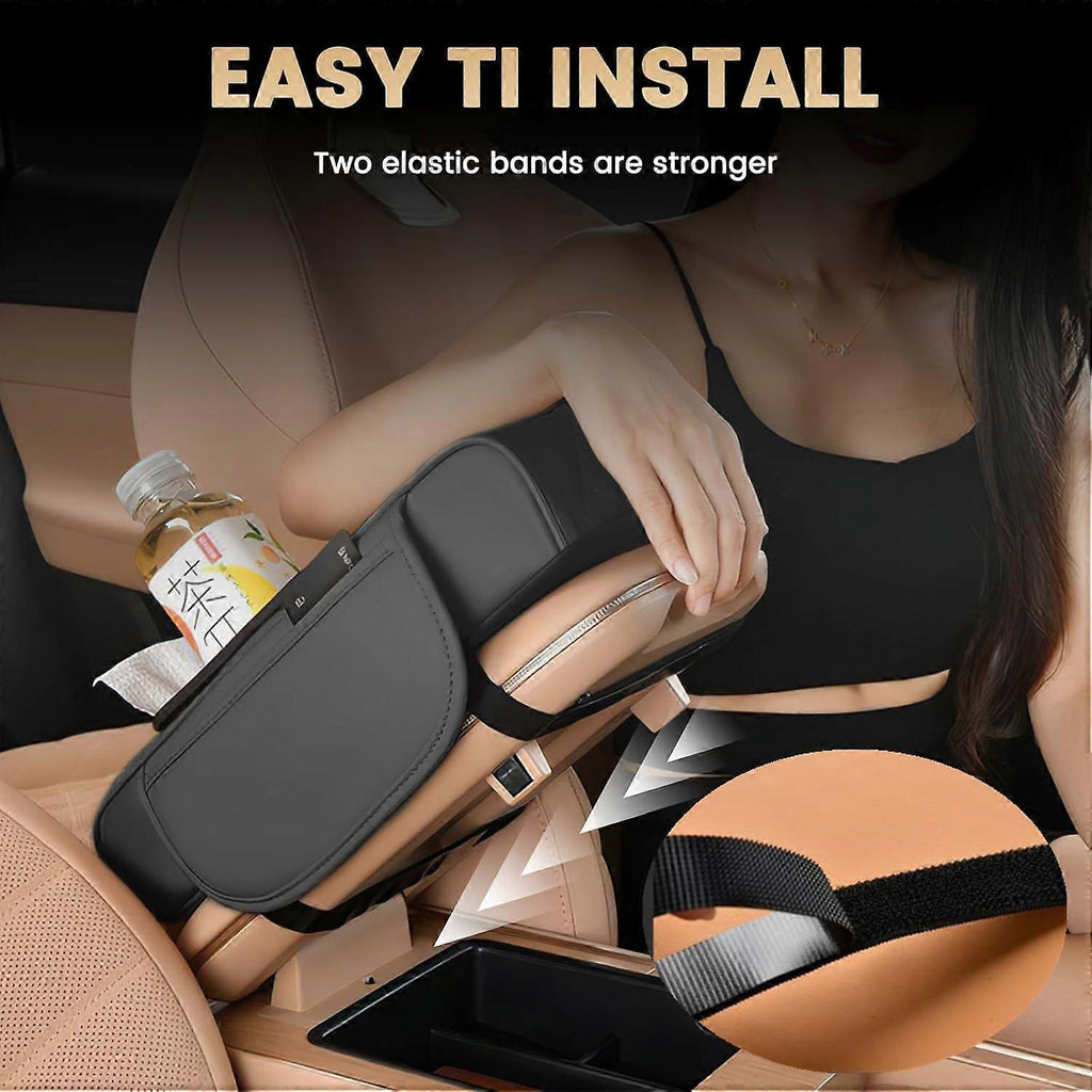 1.5In1 Design: Car armrest storage box features dual cup holders, phone slot, tissue box compartment, and side pockets for wallets, accessories, and essentials 2.Excellent Support: Enjoy the benefits of superior support as this car armrest pad remarkable stability, ensuring that your arms are comfortably positioned during long drives 3.Leather Material: Center Console Cover Crafted from soft and skinfriendly waterproof leather with stitching; Interior filled with thickened sponge that regains its shape after compression 4.Easy To Install: Car armrest heightening pad, adjustable nonslip straps install in seconds; stays firmly anchored even during driving vibrations