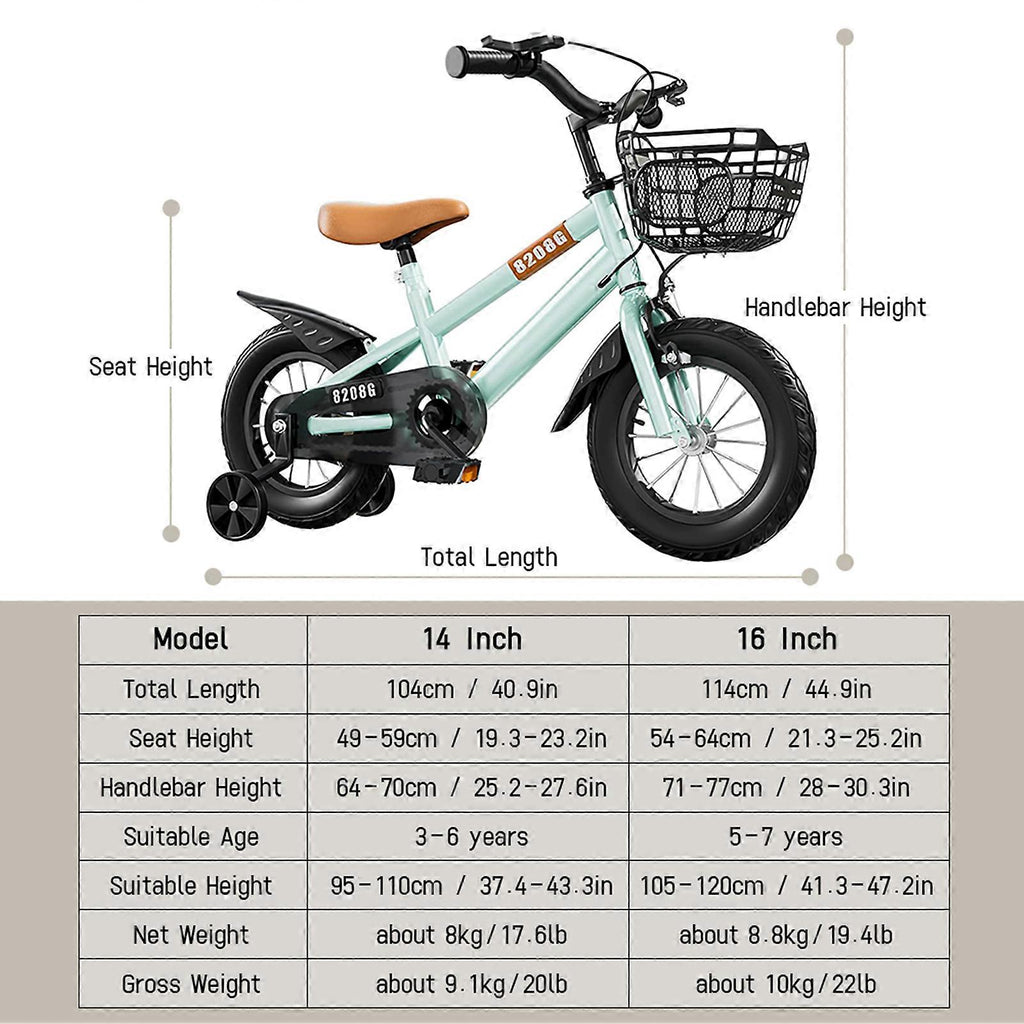 Feature: 1. High carbon steel frame: Sturdy and durable, ensuring the safety of children. 2. Wear-resistant tires: Provide a stable riding experience, suitable for various road surfaces. 3. Adjustable seat: Can be adjusted according to the child\u0027s height to ensure comfort. 4. Sensitive double brakes: Front and rear double brake design, stable braking, ensuring the safety of children. 5. Safety auxiliary wheels: Prevent side flip, provide extra stability. Specification: Children's bicycle, student's bike, with auxiliary wheels, suitable for children aged 3-7. Features: High carbon steel frame: Sturdy and durable, ensuring the safety of children. Wear-resistant tires: Provide a stable riding experience, suitable for various road surfaces. Adjustable seat: Can be adjusted according to the child's height to ensure comfort. Sensitive double brakes: Front and rear double brake design, stable braking, ensuring the safety of children. Safety auxiliary wheels: Prevent side flip, provide extra stability. Specifications: Material: High carbon steel Color: white, red, green (optional) Model: 14 Inch, 16 Inch??Optional?? Suitable Age: 3-6 years, 5-7 years Suitable Height: 14in: 95-110cm / 37.4-43.3in 16in: 105-120cm / 41.3-47.2in Net Weight: 8kg / 17.6lb(14in) 8.8kg / 19.4lb(16in) Gross Weight: 9.1kg / 20lb(14in) 10kg / 22lb(16in) Package list: 1*Children's bicycle Package List: 1*Children's bicycle