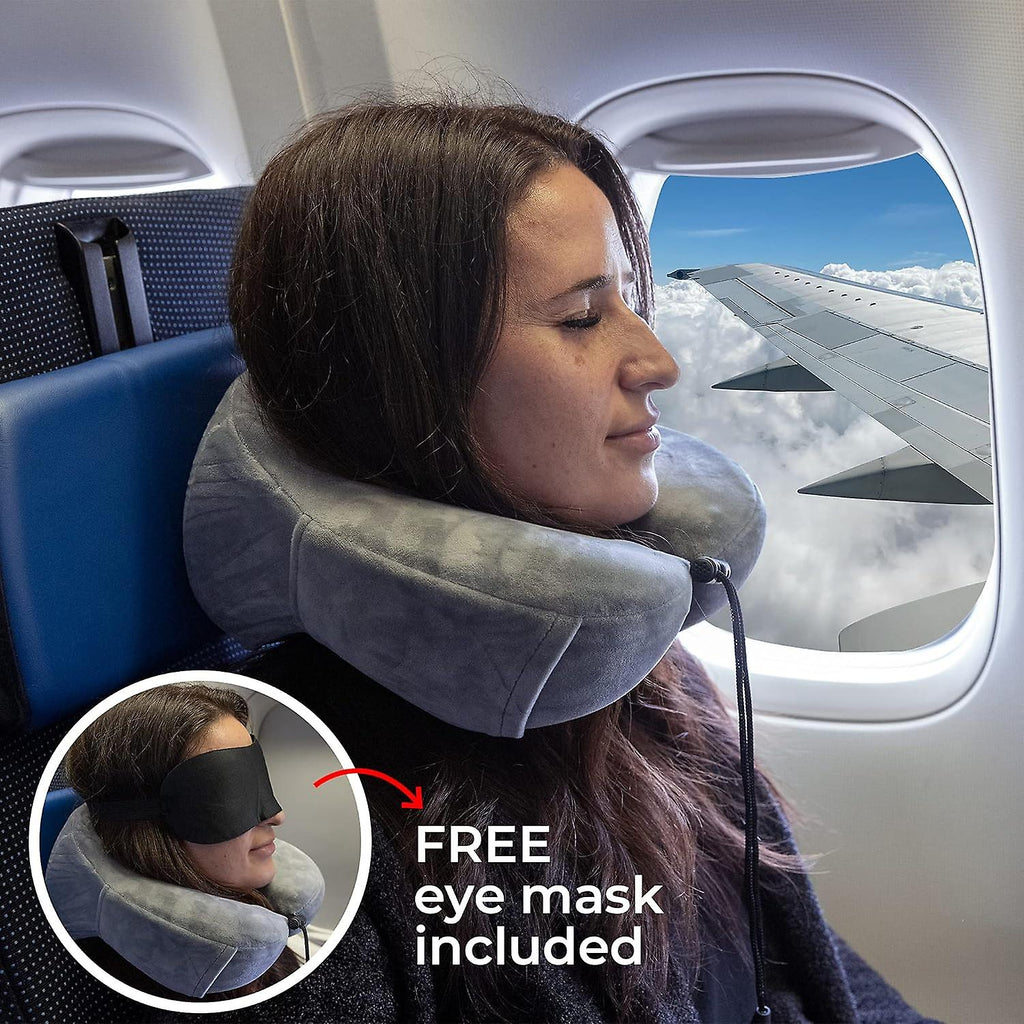 describe: Memory Foam - Our memory foam is made of high quality materials to provide a long and comfortable sleeping experience without losing its original shape. It is soft enough to conform to your body, yet firm enough to maintain your position while sleeping or relaxing. Ideal for coaches, planes, buses, trains and even watching TV at home. Breathable - The memory foam pillow is made of high quality spandex material that absorbs sweat and is gentle gentle on your skin, providing maximum comfort on your travels. MACHINE WASHABLE COVER - When it's time to pack, simply remove the cover and throw it in the washing machine! Machine washable, you'll have a clean, fresh pillow every time you travel. THE PERFECT TRAVEL COMPANION - Let's face it, traveling can be uncomfortable. With this memory foam neck pillow, you'll never have to worry about a stiff neck due to awkward sitting positions again! A handy phone pocket keeps you connected during breaks on the go. Additionally, the included earplugs and eyelets ensure ultimate comfort and relaxation. PORTABLE AND COMPACT - This lightweight, space-saving pillow measures approximately 11" x 11" x 12", 7 cm (11 x 11 x 5 inches) and weighs approximately 0.3 kg (0.7 lbs). This travel pillow has a minimalist design. It doesn't take up much space and fits in your own handbag so it doesn't take up extra space in your suitcase or backpack, and the pillow strap easily attaches to the handle on any bag or luggage.