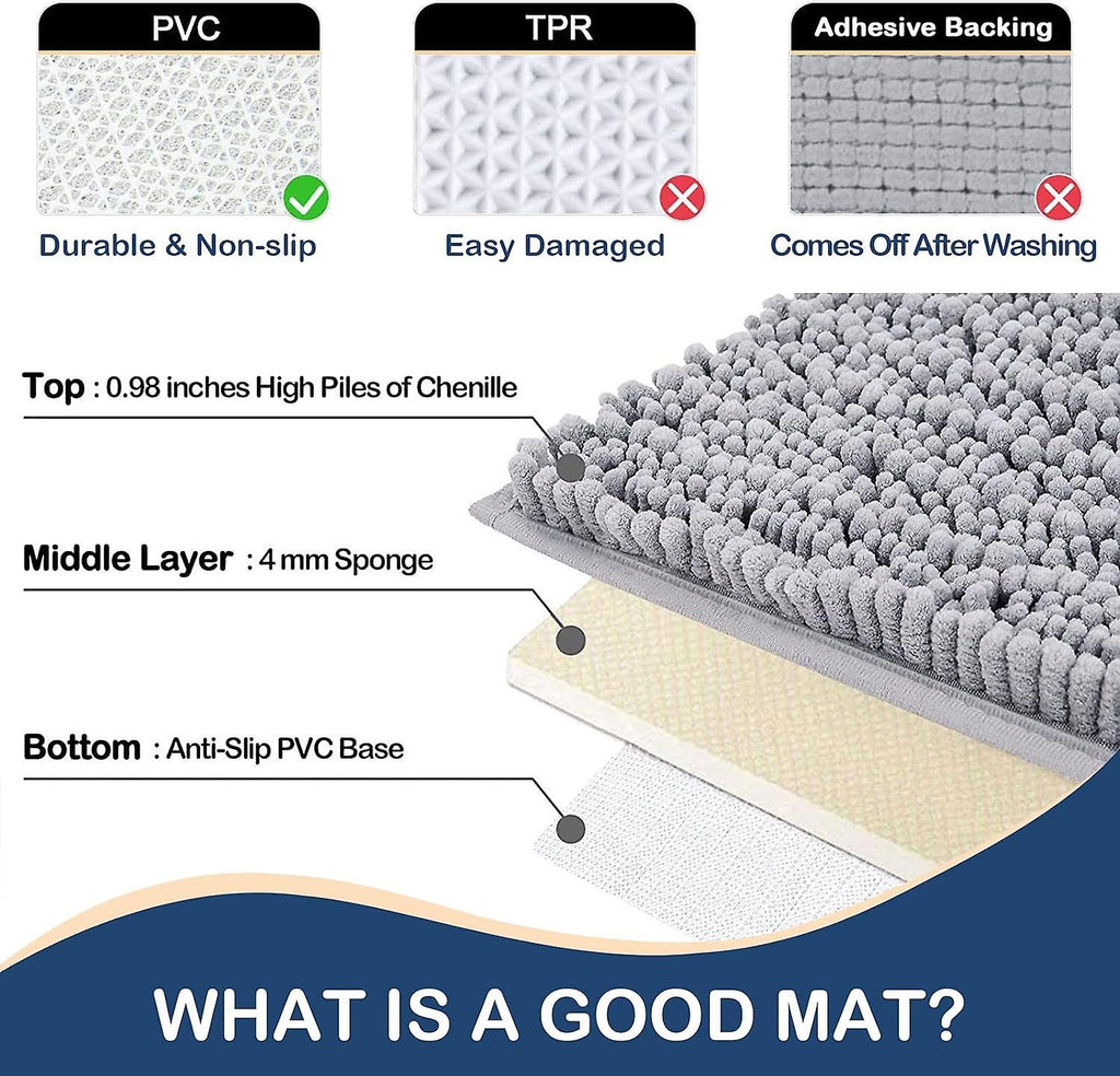 describe: [Ultra-soft plush] The luxurious bathroom rug has a soft and comfortable feel and provides superior comfort and support. Soft down will soothe your tired feet and protect your toes from the cold of the ground. 1 inch (approx. 2.5cm) high soft microfiber, unique fiber locking technology, softer, thicker and better textured than ordinary chenille. Every time you step out of the shower or bathtub, you will enjoy exceptional comfort as if you were on a cloud. [Fast Absorbency] Our gray bathroom rugs are made up of thousands of individual 1 -Inch ultra-soft microfiber pile. The thick chenille fabric absorbs water quickly, helping soil sink in front of pots, showers or sinks. Moisture is trapped in the high pile of the rug, so the bathroom rug dries quickly. [Non-slip PVC backing] The aromatic chenille bathroom rug has a non-slip sole made of high-quality mesh PVC -Material that prevents the bathroom rug from moving and slipping, protecting you and your family from possible slips or falls in the bathroom. The middle layer is made of 4mm thick memory foam, which feels more comfortable in the pillow. WARNING: Only place the bath mat on a clean and dry surface. Submerging a bathroom rug in water can cause it to slip. Always keep the bottom of the bath mat dry. [Machine washable and dryable] These chenille bath mats are easy to clean. Machine wash in cold water and mild detergent, tumble dry low or hang to dry. The color of the bathroom carpet will never fade even after many washes. The ultra-soft microfiber material does not shrink or feel rough even after washing, so your bathroom rug will stay beautiful for a long time. [Build your bathroom oasis] Our mats are in Available in many colors and sizes and can be widely used as bathroom mats, shower door mats, bathtub side mats, kitchen mats or simply placed in front of the sink or in the living room, bedrooms, hallways, entrances, balconies, sand wool, car seats. As long as you want to support and warm your toes, this pad and pillow can be placed anywhere in the house and also be a perfect decoration for the whole family!