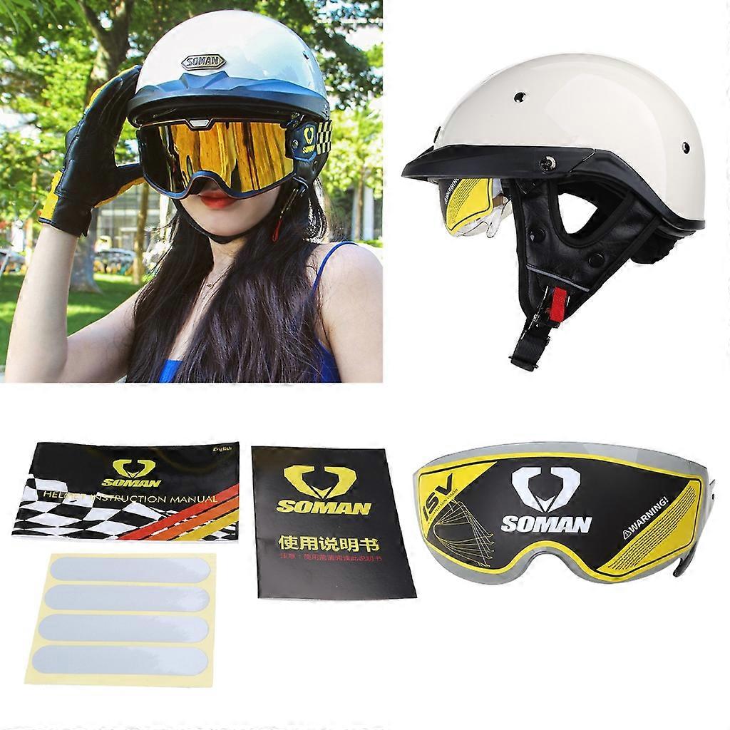 Features: High strength ABS-shell, lightweight and impact resistance. Sleek-and lightweight design reduces wind noise. Multi-density EPS-safety buffer layer-offers state-of-the-art energy absorption. Comfort soft padding liner uses breathable technical fabric, high-grade fabric, soft, absorbent, ventilation, better flexibility; more cleanliness. The glasses design, provide UV-protection. Quick release buckle for a secure fit that will stay on your-head. Removeable ear protector. Reasonable design: Give your ride a lot of fun. Specifications: Material:ABS Size:As Picture Shown Note: .Please allow 1-2cm errors due to manual measurement, make sure that you do not mind before you order. .Due to the difference between different monitors, the picture may not reflect the actual color of the item. Thanks for your understandings. Package includes: 1x Motorbike Helmet