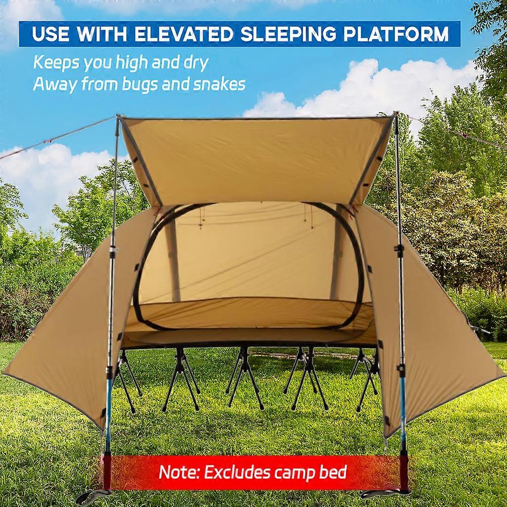Lightweight 1-person folding bed mountain tent, waterproof and stable, use withelevated sleeping platform, providing a comfortable outdoor experience. Features: Lightweight Design: Lightweight 1-person tent, easy to carry outdoors. Use withElevated Platform: The elevated sleeping platform keeps dry and away from bugs and snakes. Waterproof and Stable: The outer tent has a waterproof value of 3000mm to prevent rain from entering. Spacious Space: The tent is long enough to provide extra space for personal items. Double-layer Structure: The mesh double-layer structure is ventilated and mosquito-proof. Note:Excludescampbed Specifications: Colour: Coffee/Orange/Grey(Optional) Material: 20D double silicon, 8.5MM 7075 aluminum pole, 20D nylon mesh Outer Tent Net Weight: 750g / 1.65lbs (including nails12 ropes4) Inner Tent Weight: 950g / 2.09lbs (including 8.5MM*2) Unfolded Size: Outer tent: 256*256*110cm / 100.8*100.8*43.3in, Inner tent: 200*66*100cm / 78.7*26*39.4in Storage Size: Outer tent: 25*14cm / 9.8*5.5in Inner tent: 44*10cm / 17.3*3.9in Package Size: 46*13*13cm / 18.1*5.1*5.1in Package Weight: 2.1kgs / 4.6lbs Package list: 1*Outer tent 12*Nails 4*Ropes 1*Inner tent 2*Tent poles